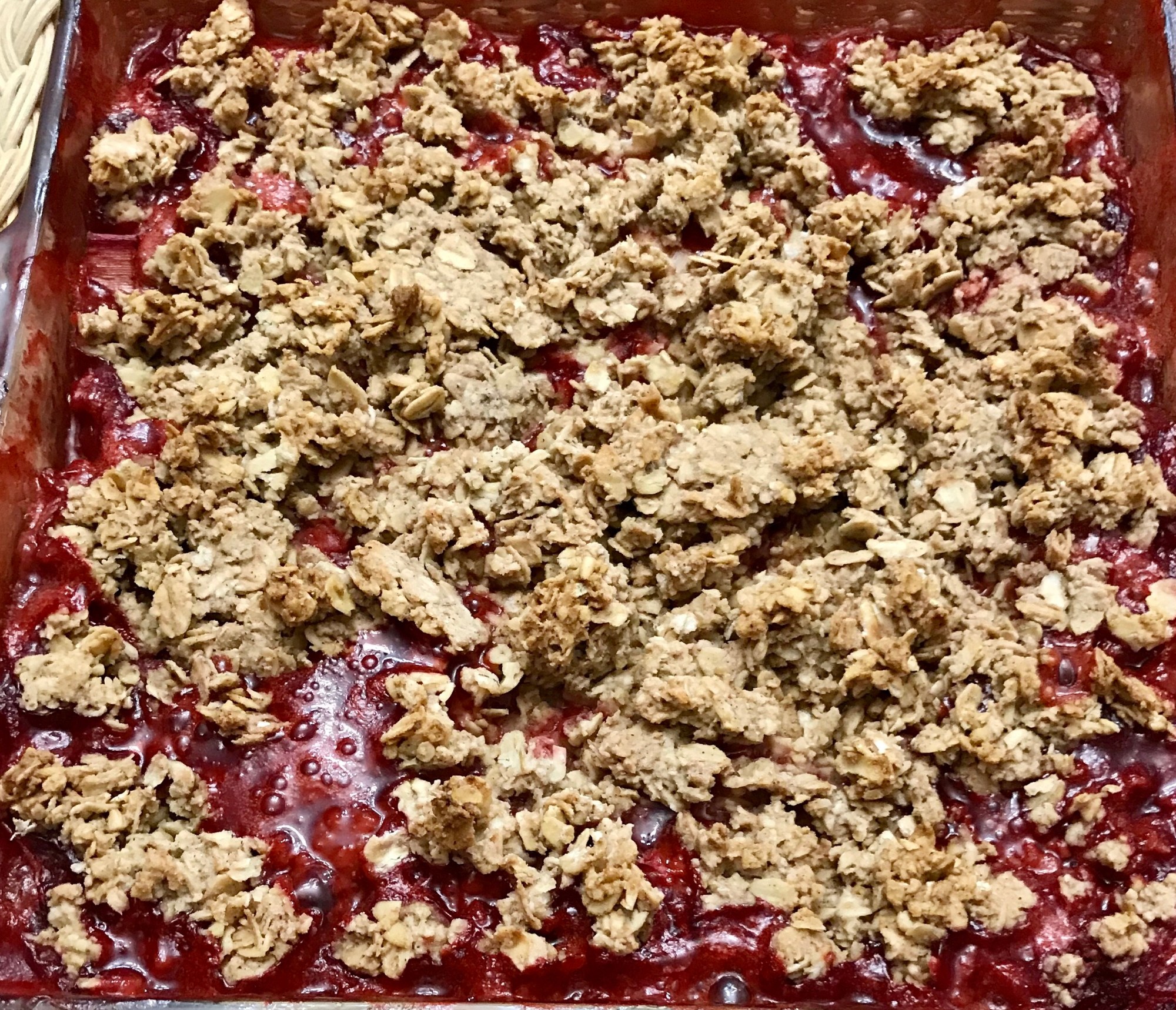 When I recently saw rhubarb in a local store, along with plenty of red, ripe strawberries, I realized both fruits were in season. It then occurred to me that recipes often combine the two ingredients for a fresh, plant based treat. Therefore, I decided it was high time to research and play with rhubarb in honor of Dad’s rhubarb growing and Mom’s pie baking. Both fruits are in season now through the first half of June, so it’s the perfect time to give this recipe a try! This is a much lighter dessert than that pie of my childhood, but it earned a tasty stamp of approval from my daughter and husband as well as my taste buds. Let me know what you think.