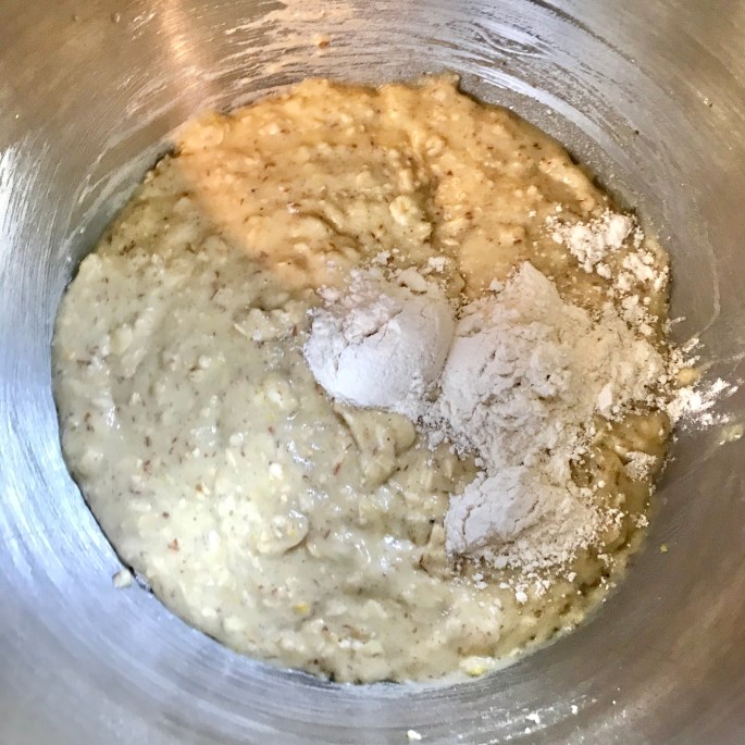 In a small bowl, combine the flour, oats, baking powder, baking soda and salt. Set aside.