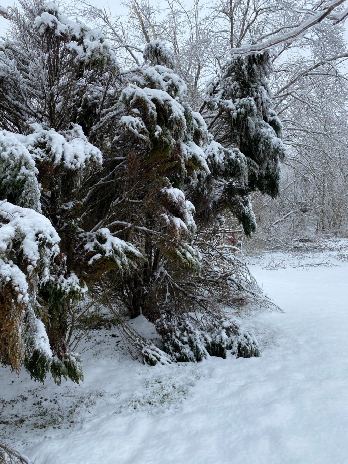 The following Monday, due to the storm’s impending presence, I made the call to once again, prepare dinner early.  (My Depression-era Grandmother Slater would be so proud by the way in which I prioritized food on the nights of both storms!)  We had just sat down to eat, when we heard what sounded like a gun-fire.  Then came another, and another, and another as branches all around our rural home began breaking.  ½ inch, or thicker, of ice coated trees making them look like winter goblins with tentacles of certain danger and doom.