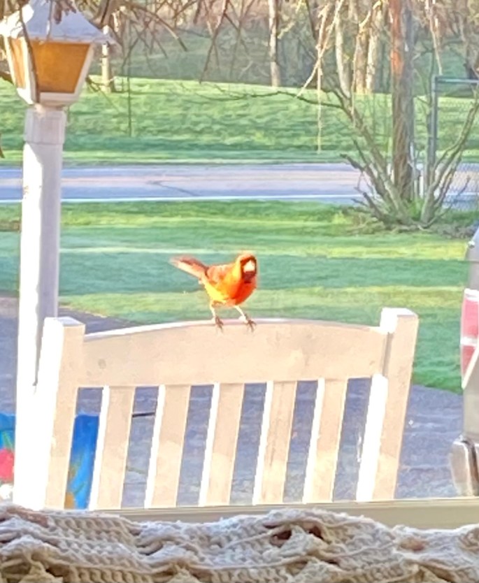 Not long after both couples moved in, we also noticed they each had the habit of dining outside. While that wasn’t particularly unusual, given the mildness of our early April weather, it was the habit of the males feeding the females that was most striking. In fact, it appeared as if they kissed first, allowing the female to take the food from the male’s mouth. What love birds both pairs appeared to be!