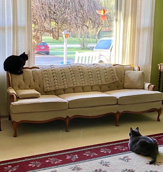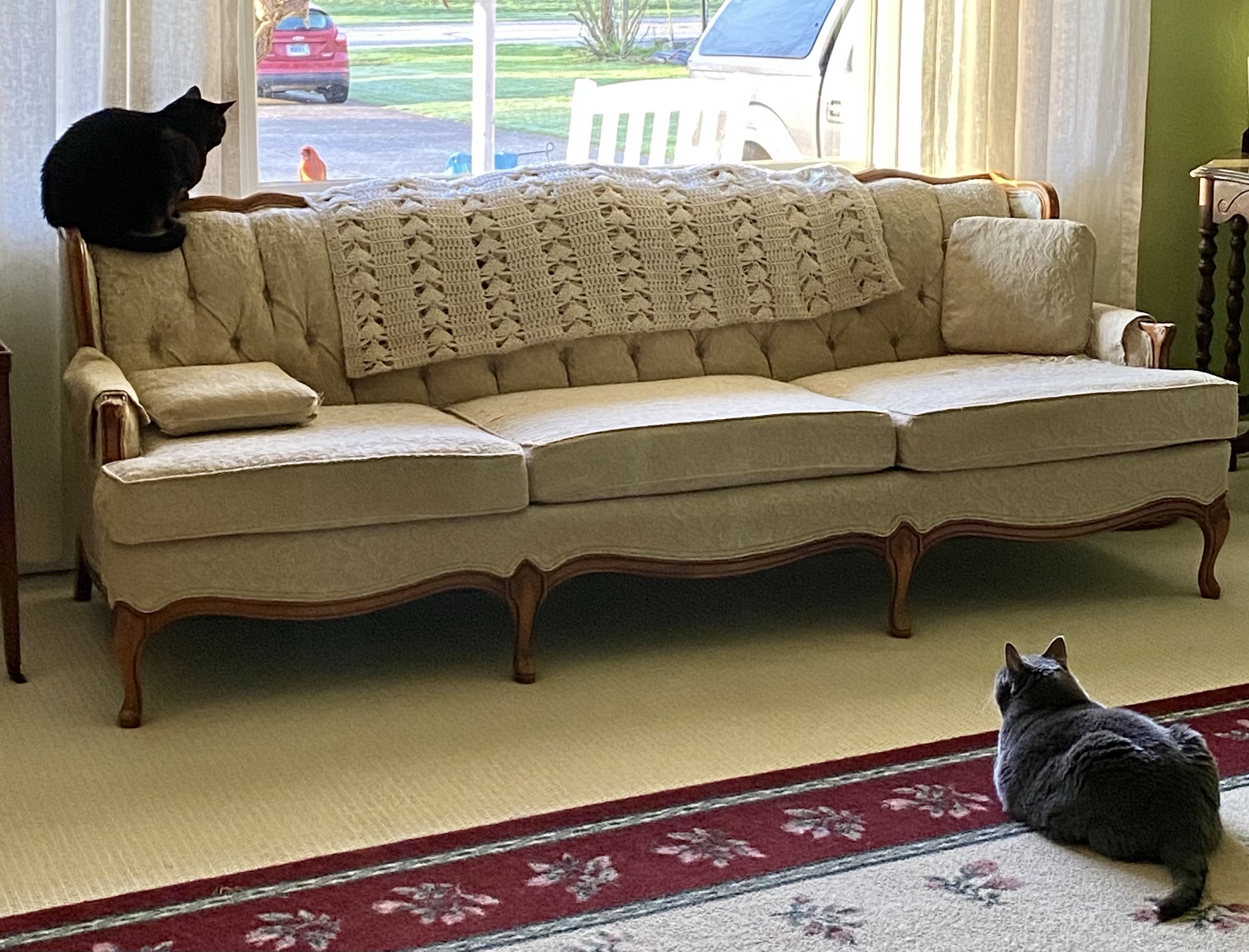 When their habit of banging around first began, the two pairs could be observed pounding away with great intent. This, hysterically, drew great attention from both of our lacidzical cats. Our feline companions could, with great regularity, be found wherever our neighbors could be seen industrially belting away–so curious were our cats’ desire to see our neighbors’ carrying-ons.