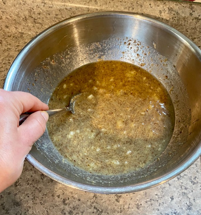 Combine ground flaxseed with water in a small bowl and set in the fridge for about 15 minutes to thicken.