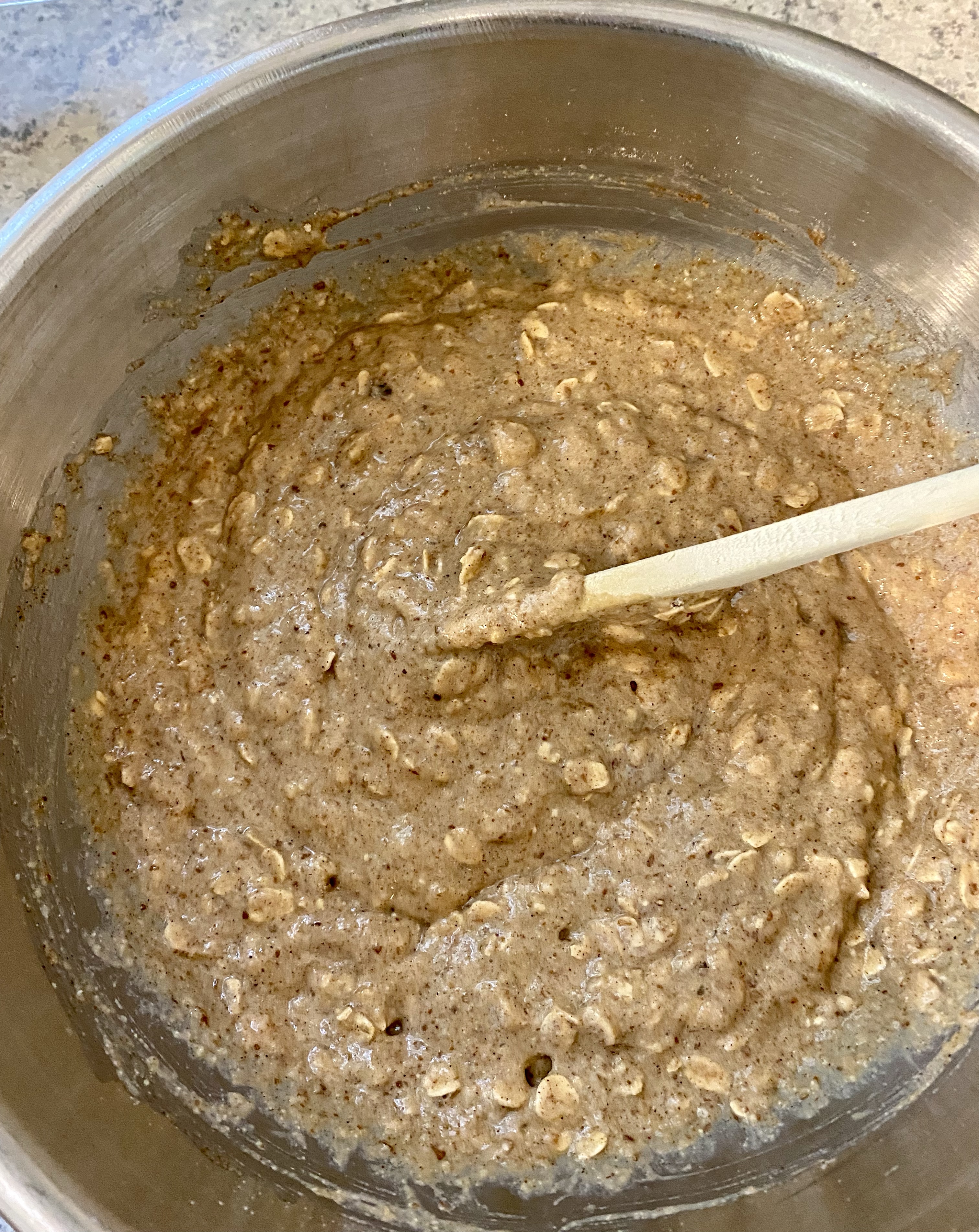 Add in flour-spice mixture and mix the batter 1-2 minutes until the batter begins to thicken.
