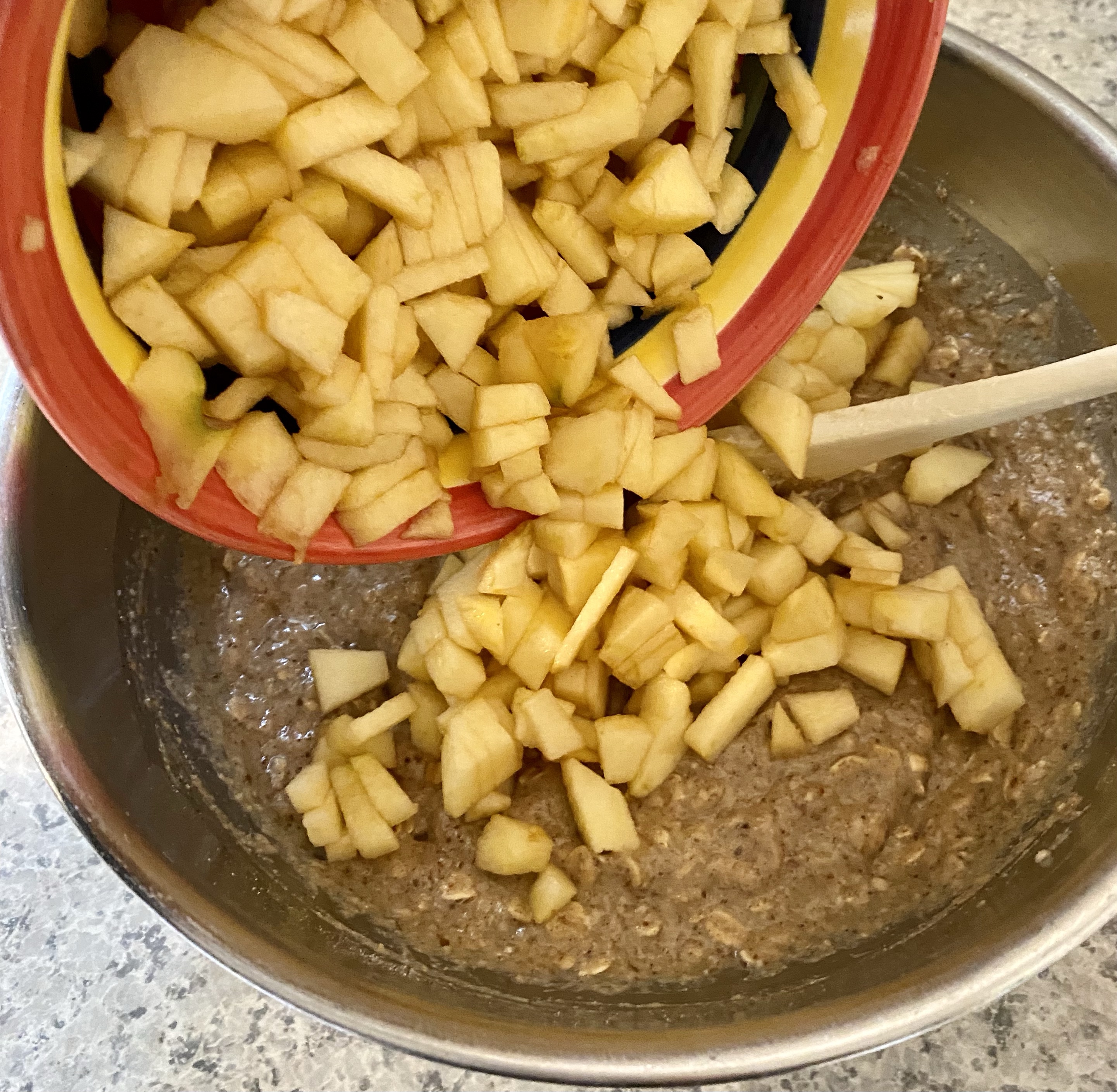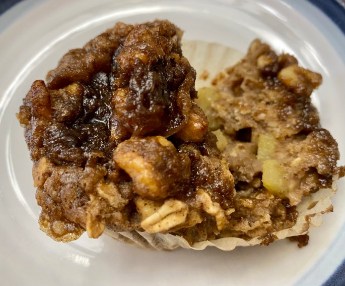 Upon reflection of this story, and the added remembrance of our family’s introduction of Honeycrisp apples, that, a-hem, a seed of an idea was planted. Could I create an apple-spice muffin recipe without cream cheese frosting–for which many in my family will be saddened, I’m certain, but with partial nuts? (Some like nuts, some do not.) The answer is what follows below.