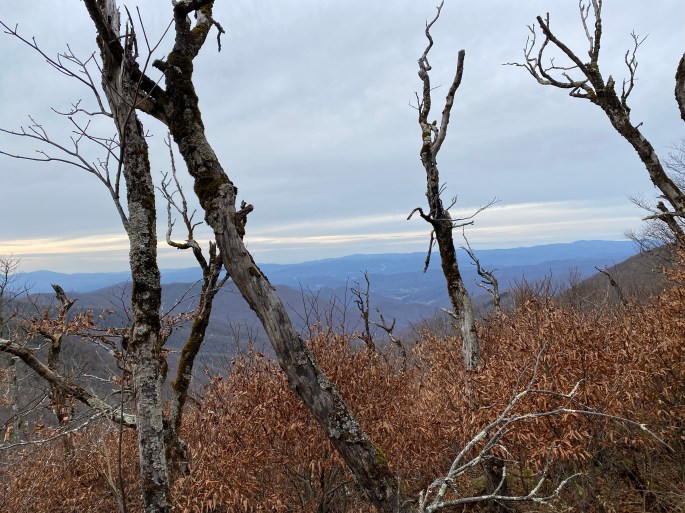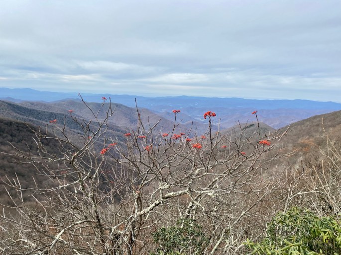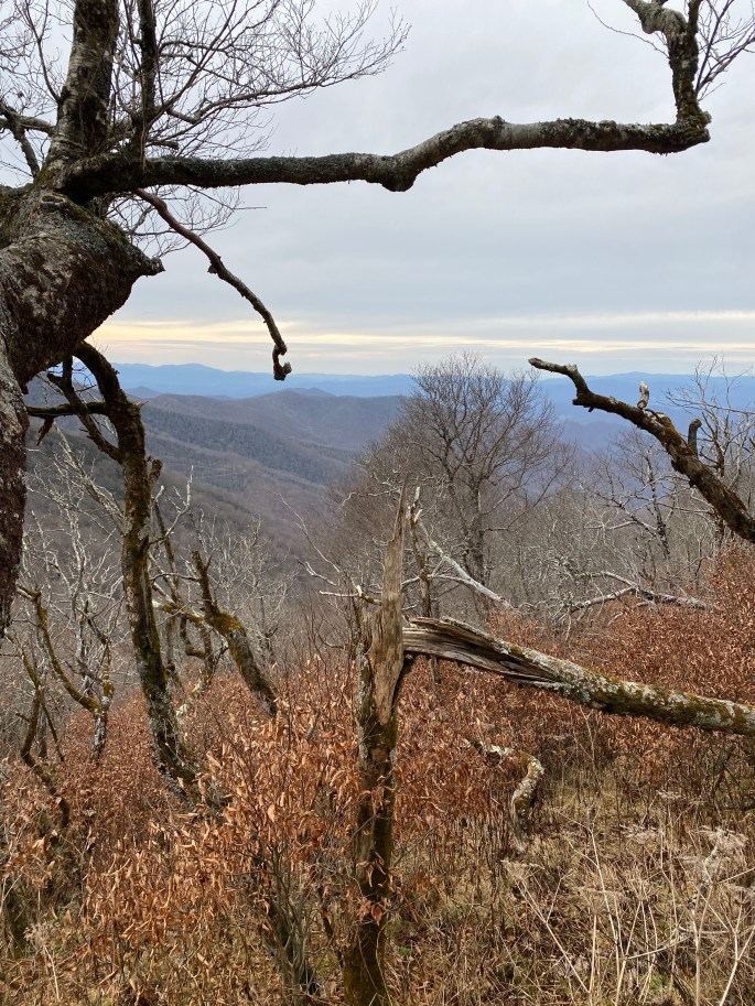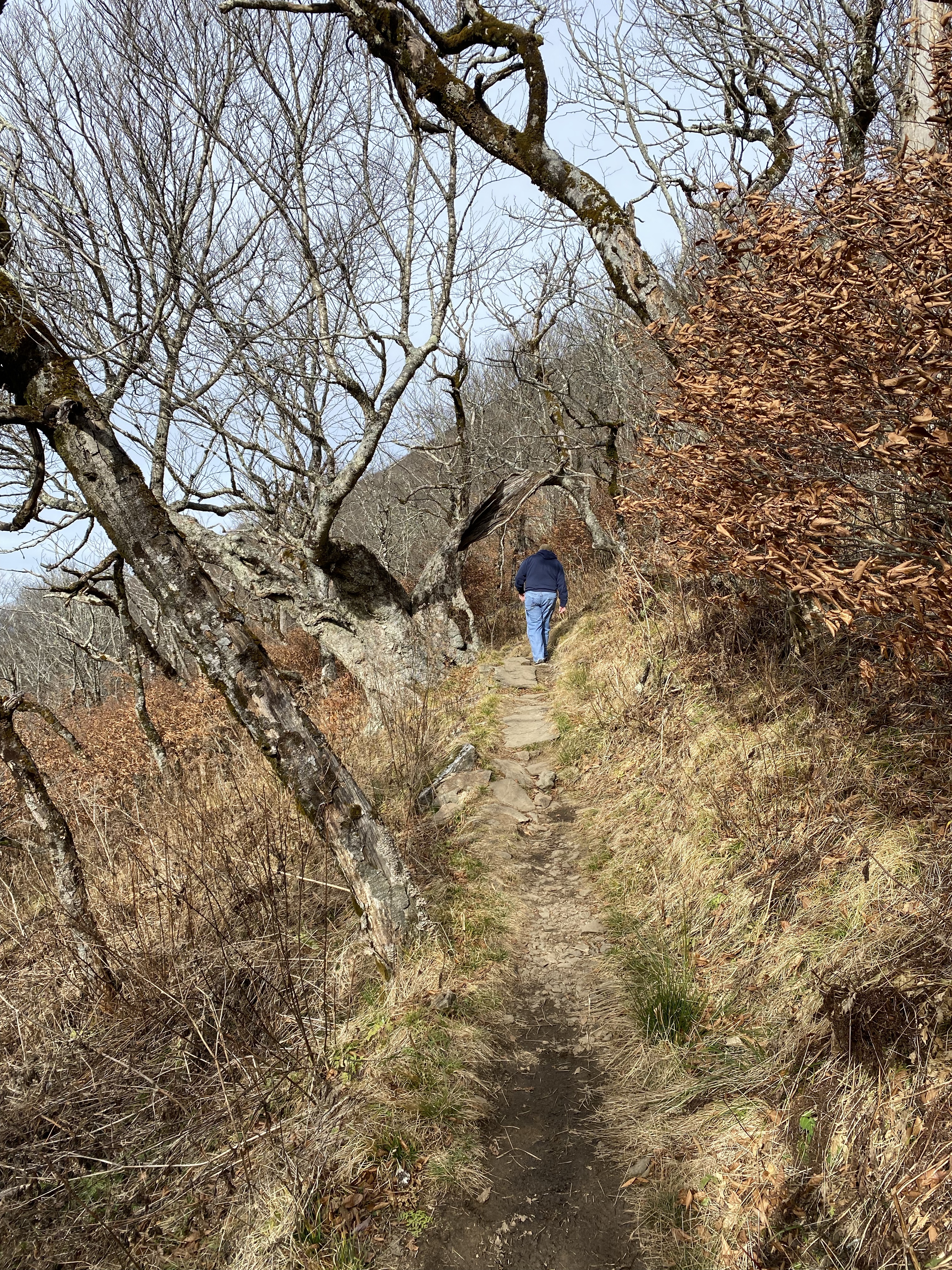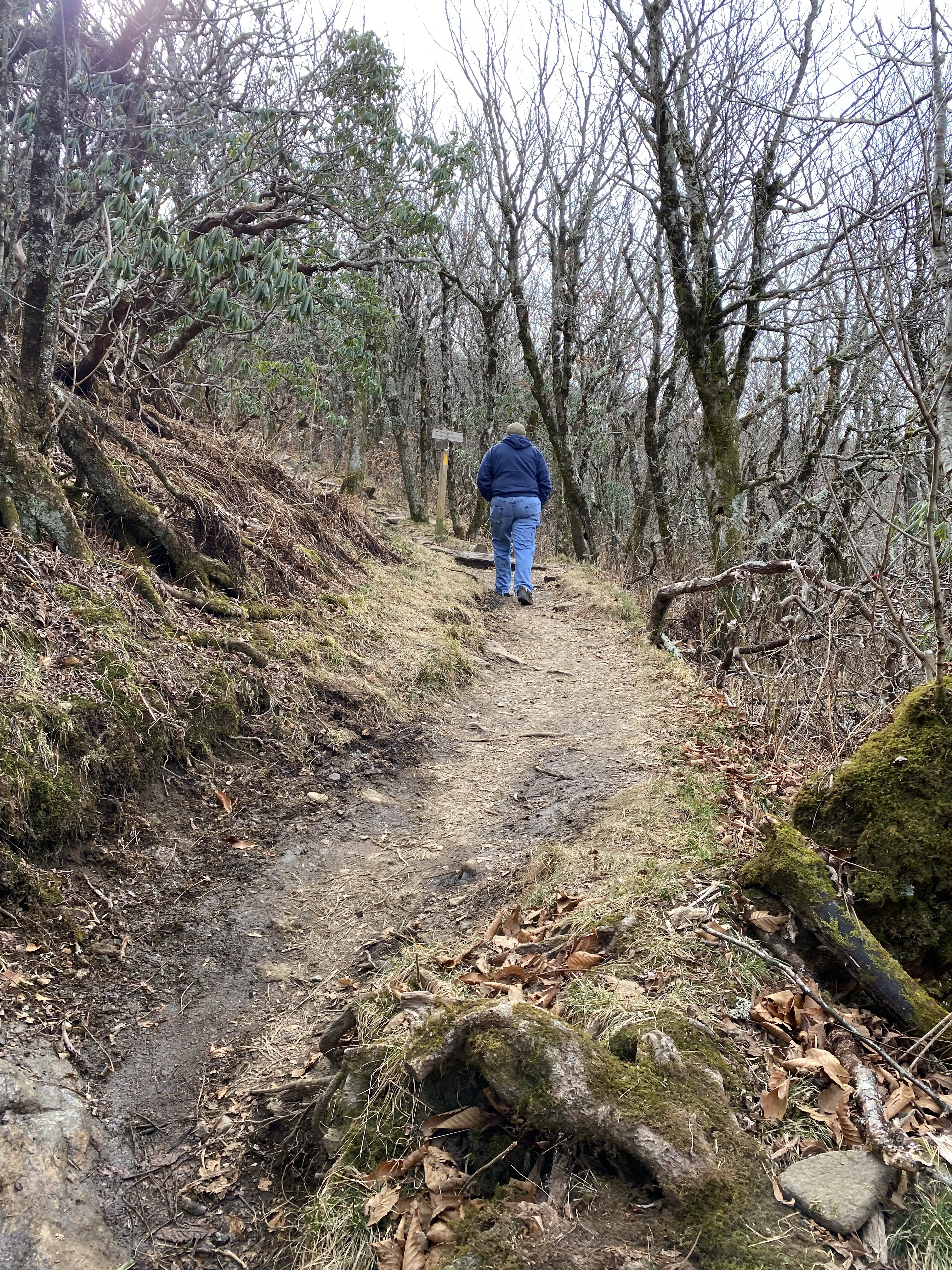 There were two trails at the top of our list of preferred hiking experiences–one that led to Rattlesnake Lodge and another to the top of Craggy Pinnacle. Unfortunately, we were not able to hike either one. Instead, on one of the afternoons during our trip, we found ourselves at the closed-for-the-season Craggy Garden Visitor Center, with its ample parking area and scenic views, staring at a map of hiking trails that could all be accessed from the parking lot. We picked one that wasn’t part of our so-called list-for-the-day and headed off down the trail without conducting any research. Why not, right? After all, we had already successfully hiked one of the trails shown on the map on a previous trip; therefore, how much more difficult could another trail in the same area be?