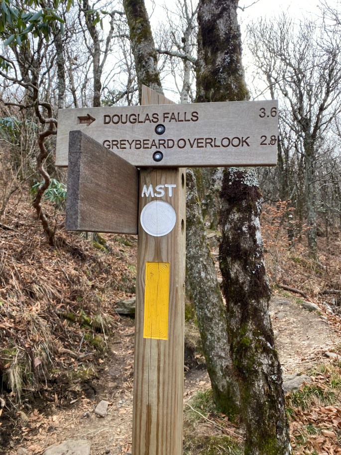 Stepping onto the trail, which was part of the 1,174 mile long Mountain to Sea Trail that crosses North Carolina, we saw a trail marker indicating that Greybeard Mountain Overlook was a “mere” 2.8 mile hike and Douglas Falls was only 3.6 miles away. Perfect! We had plenty of time, as it was early in the afternoon, and the mileage didn’t seem insurmountable–silly, unsuspecting fools that we were!