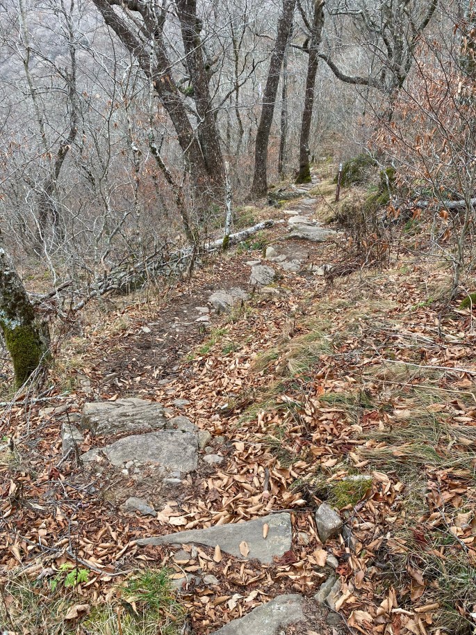 I wavered. I wanted to see more. Therefore, John, used to my enduring curiosity and energy level, said he would wait while I explored ahead a bit more. While he sat down to rest on a large rock, I carried on to the Greybeard fork which began climbing once more. Continuing further along, the path became more wet and somewhat less rocky. I stepped through muck and oozing mud as small rivulets trickled along this part of the path. To my left, through statuesque trees, I spied those aegean tinged Blue Ridge Mountains, sentinels of the BRP, standing watch over it all. I wanted to continue further, but visions of being trapped in a rocky ravine overnight surrounded by bears and numerous other critters kept me from straying too much further up the path, perhaps only hiking a ¼ of a mile more!