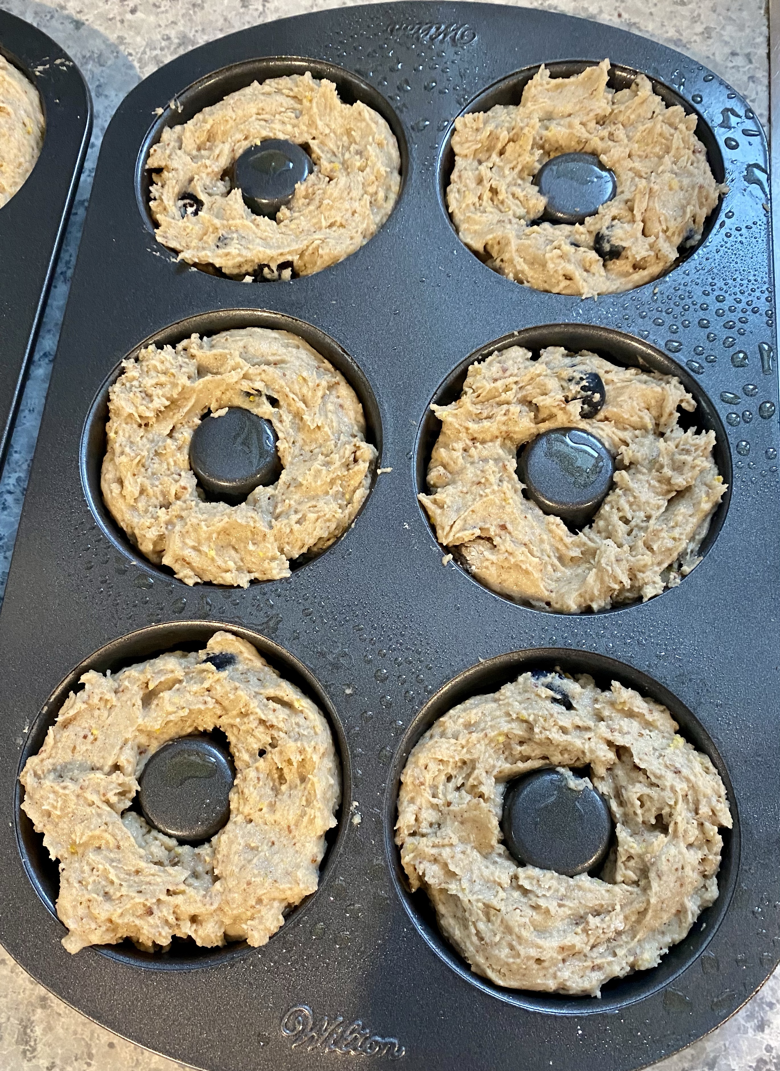 Prepare two 6-donut pans by coating with non-stick baking spray or other preferred method of “greasing”
