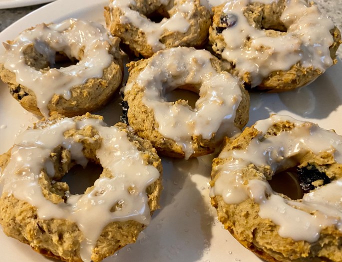 Meanwhile, using a fork, stir together glaze ingredients using less liquid at first until desired consistency is reached with the glaze looking white and thick, rather than translucent and thin. Drizzle glaze, as desired, over donuts.
