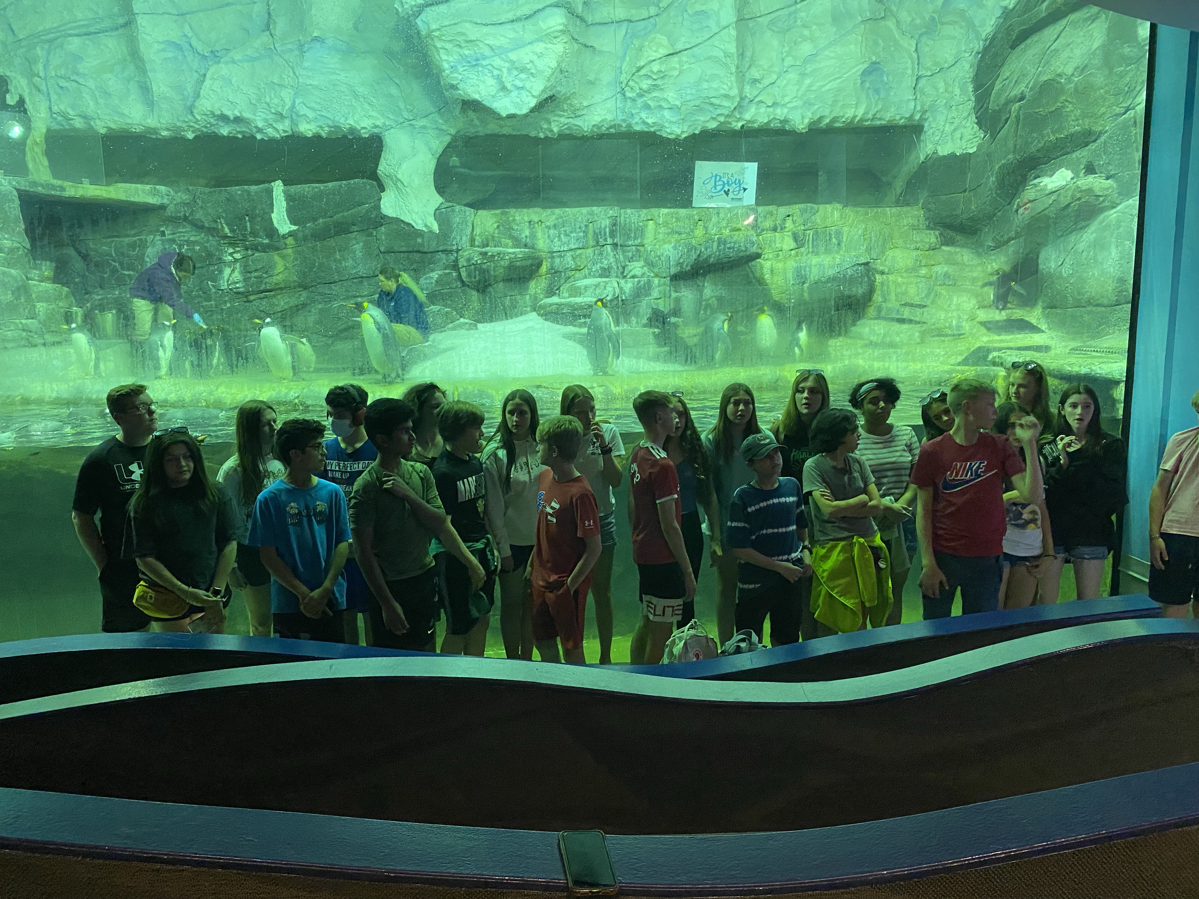Newport on the Levee and the Newport Aquarium were also fantastic stops on our whirlwind Cincinnati visit. The Levee offered plenty of dining options for the students to explore and savor. There were also options for retail and entertainment, but our focus, after eating, was the Aquarium. Students and chaperones were able to view all forms of aquatic creatures such as the dwarf seahorse, albino alligators, upside down jellyfish, stingrays, eels, cuttlefish, penguins, and so much more. Plus, we were able to test our bravery by crossing a rope bridge over shark infested waters! Well, maybe it wasn’t so much bravery that we tested as much balance. Regardless, the Newport Aquarium is always a great place to visit, especially on a hot day!