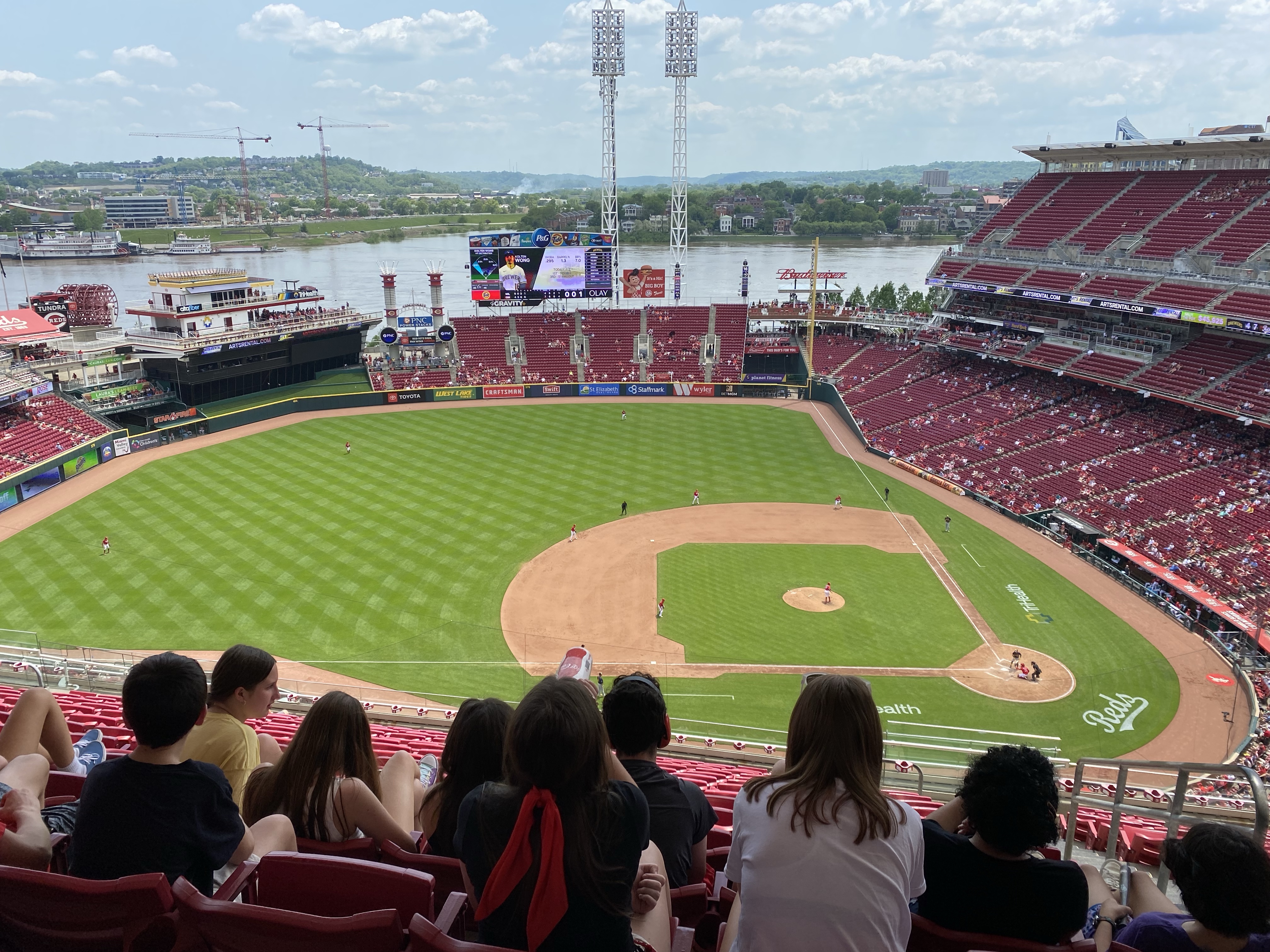 Ohio’s Queen City, Cincinnati, is known for many things, one of which is its professional baseball team, the Cincinnati Reds, and this was our first stop on our grand, post-pandemic adventure. I would later learn that the Reds were the first professional baseball team to play under electric lights, with President Franklin Roosevelt flipping on the switch in 1935. However, no special lighting was needed for a mid-day 12:35 first pitch start against the Milwaukee Brewers that our group attended. Little did we know we would also be witness to a piece of baseball history in the making.