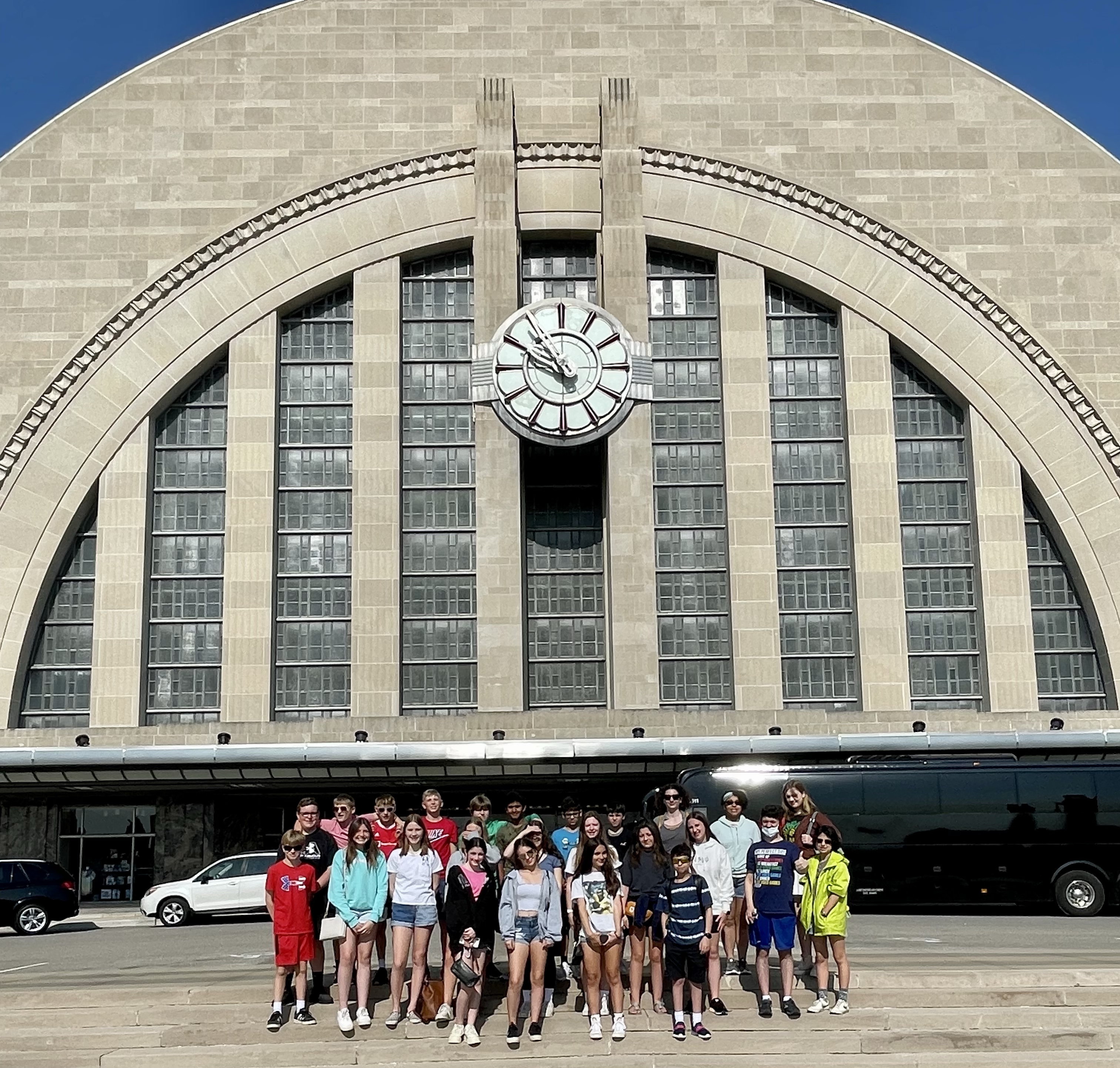 Another stop in our three day, two night adventure, was Cincinnati Museum Center, once known as the train station icon, Union Terminal. It is considered one of the last great American train stations to be built, and it is known for its art deco style, including the largest half-dome in the western hemisphere. With its so-called magical whispering fountains and the Winold Reiss mosaics, this once former grand station of transportation (trains, buses, and taxis) now features three museums, an Omnimax theater, and the Cincinnati History Library and Archives. While there, our students were able to view the Cincinnati History Museum, with its contemporary addition of 15 hidden Marvel movie characters for visitors to spy, and the Museum of Natural History and Science, with its interactive physical science lab, Dinosaur hall, Neil Armstrong Space Exploration Gallery, and Ice Age Gallery.
