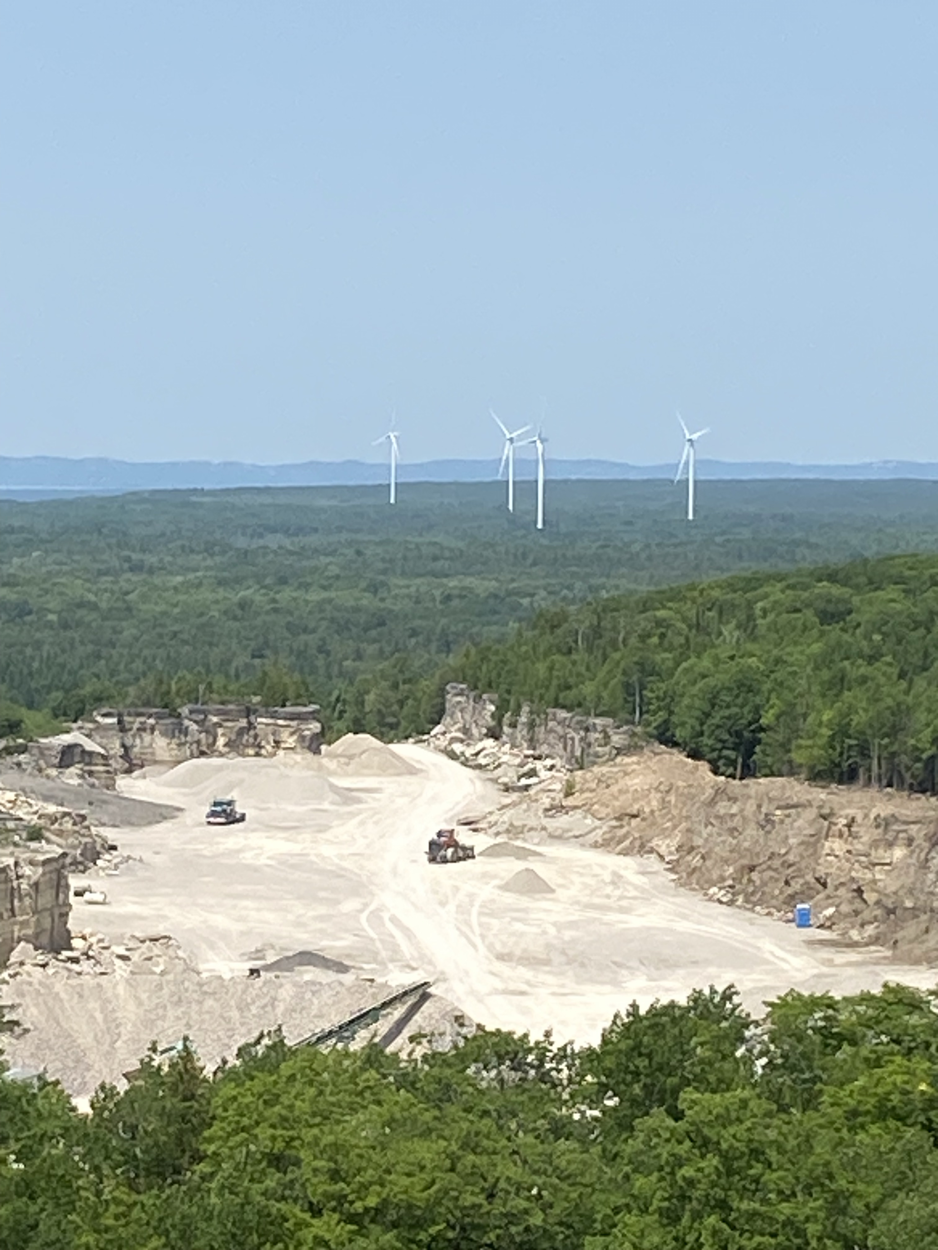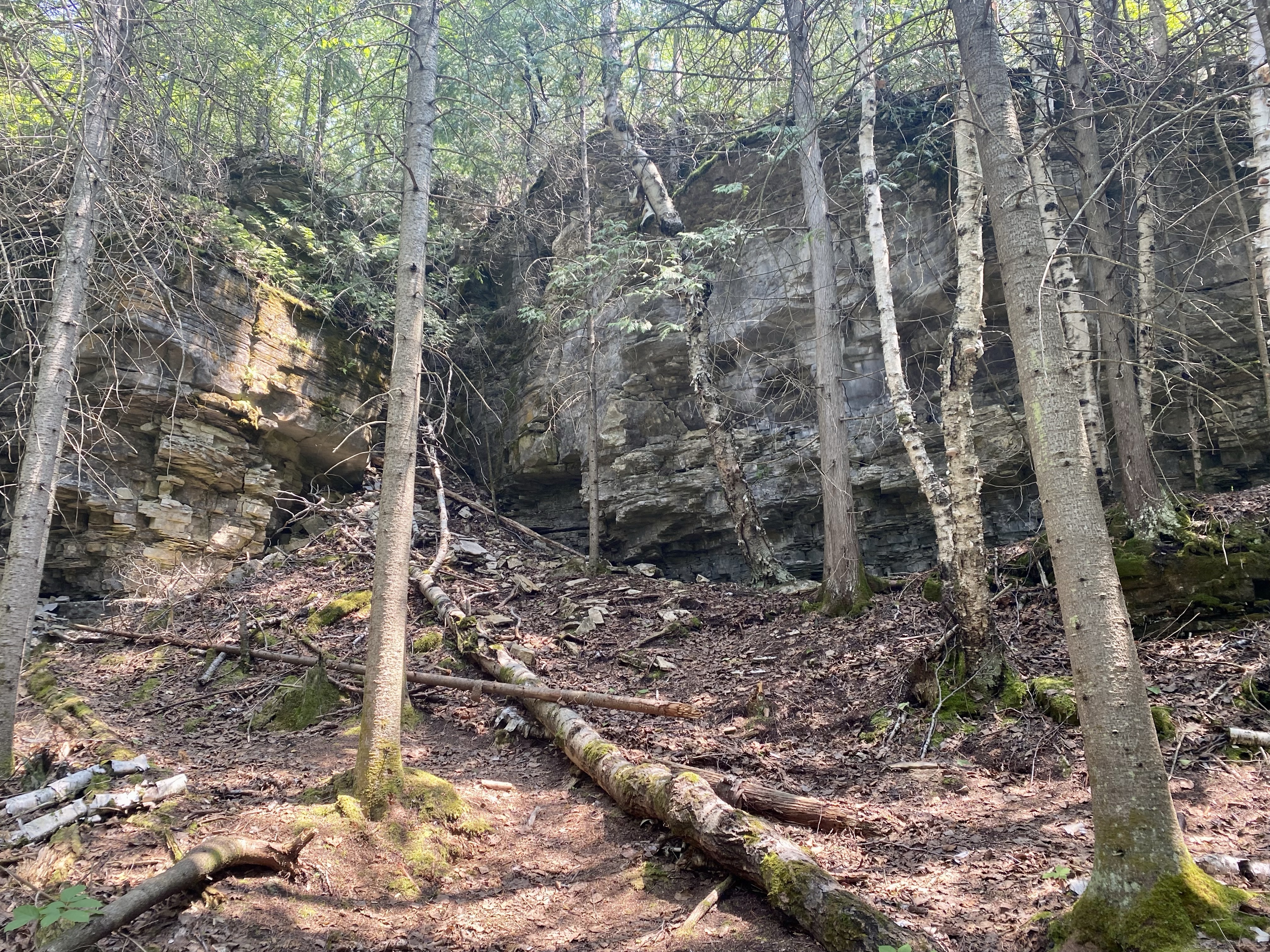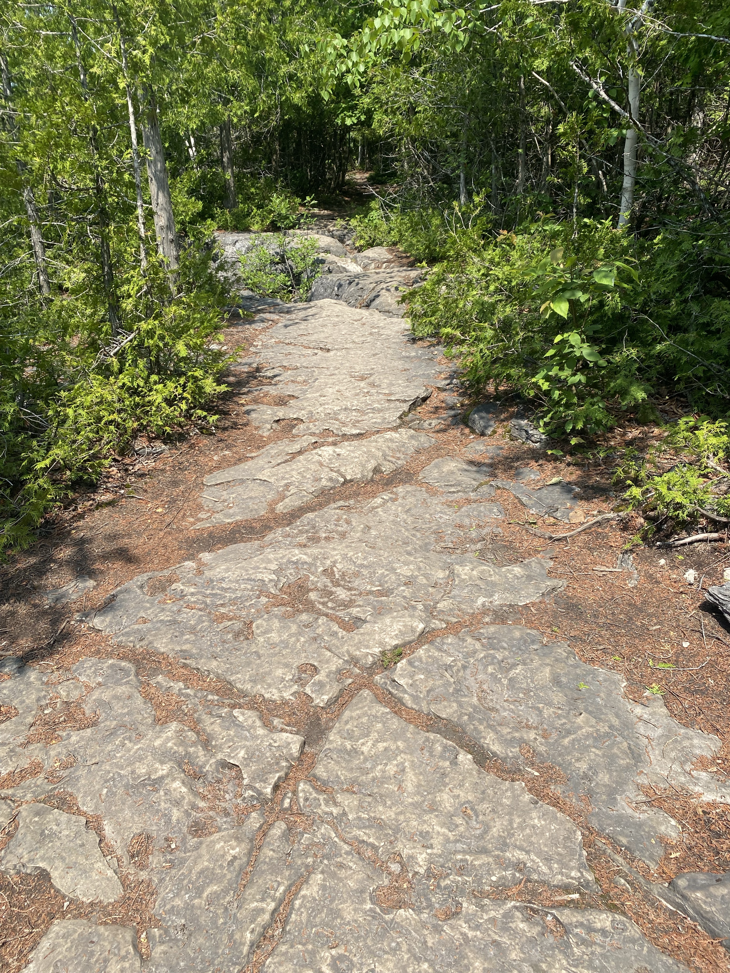 One other EBC trail John and I explored was the Cup and Saucer Trail located on Manitoulin Island. This out and back trail is 8 km (4.97 miles) long and is not for the faint of heart! Winding around a mountain with a wide variety of footing challenges (At one point, the trail has a rope for hikers to use to hoist themselves uphill!), this trail offers heavenly views from its cliffs. Made of 400 million year old silurian deposits, the cliffs earned their name because higher, cup-shaped cliffs appear perched on top of the lower saucer-shaped cliffs. While this trail kicked our, shall I say, boots, the views were outstanding, and the drive to and from the trail across Manitoulin Island was scenic, making the overall experience quite rewarding.