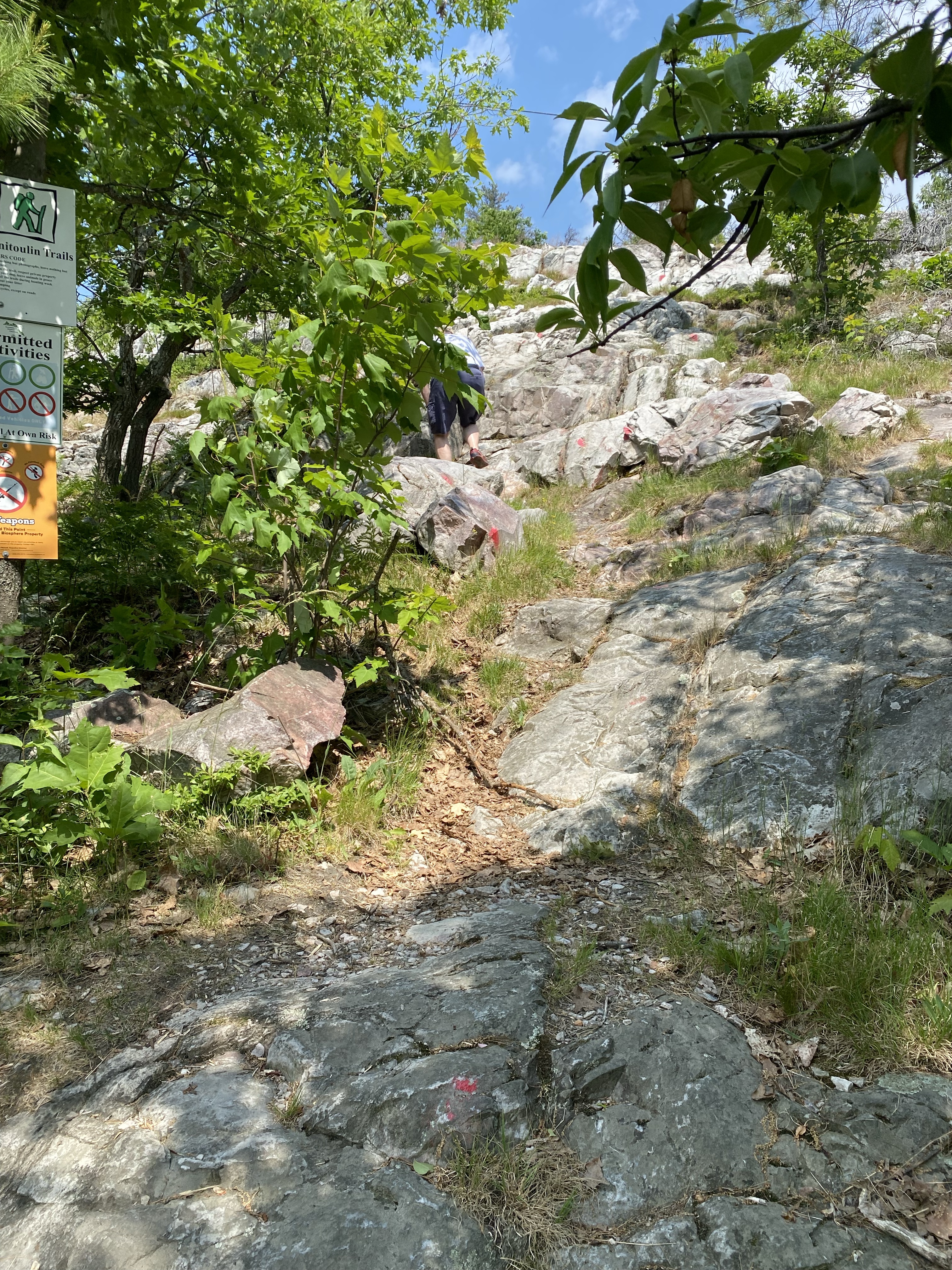 In contrast, Whitefish Falls trail does not rise straight up a mountain, but it too is a bit of a hidden gem. Finding where the trail starts took John and I a second time driving by it before we figured out where it was located. This out and back trail was partly an earthen/dirt path and, once more, partly quartzite, which can be slippery alongside the water’s edge. Once you arrive, the view (and sounds) of the falls is stellar! However, I did find the juxtaposition of the falls’ wondrous beauty, and clamorous traffic passing overhead on the highway bridge above, a startling contrast. Nonetheless, Whitefish Falls trail was a worthwhile experience.