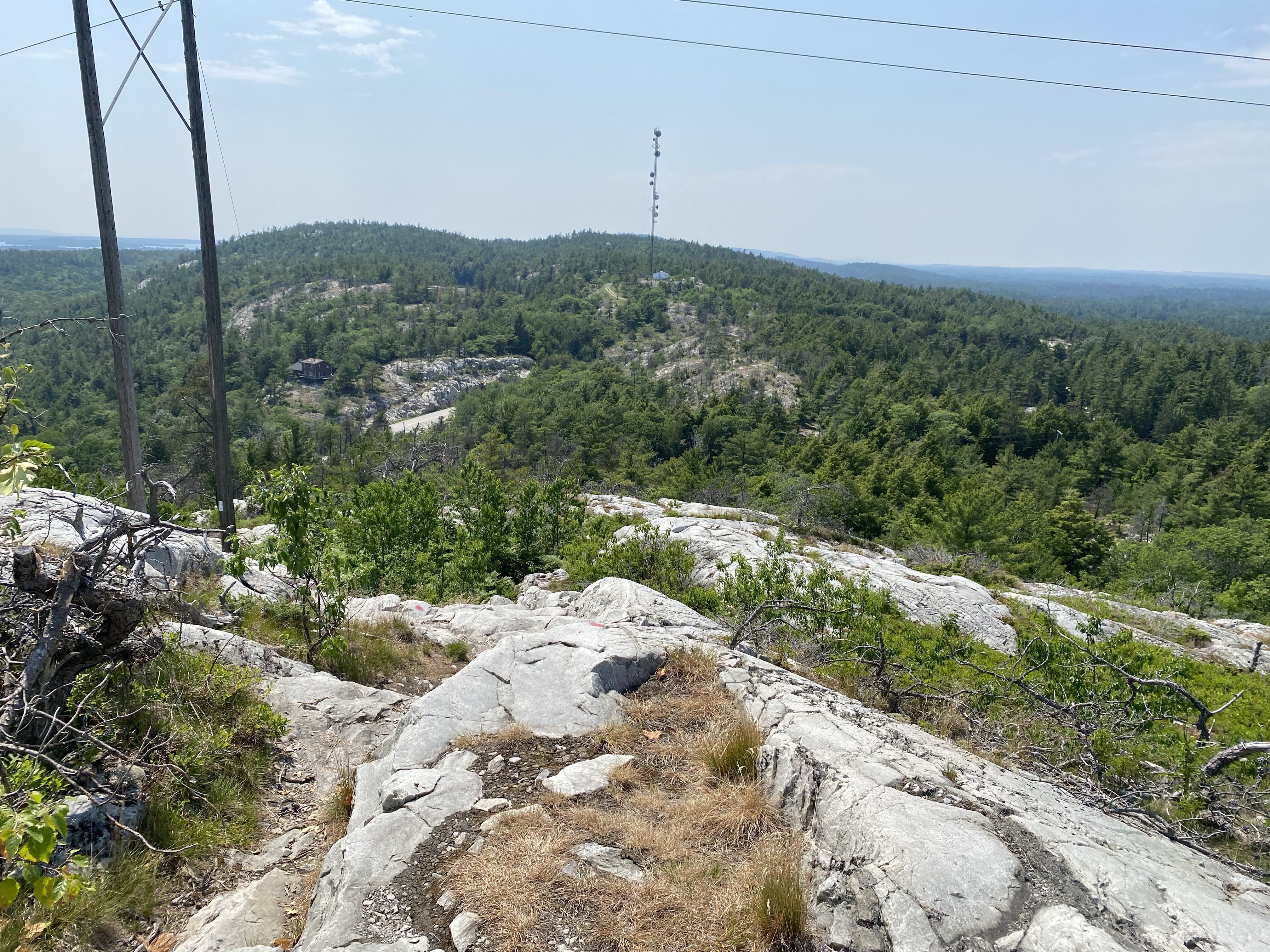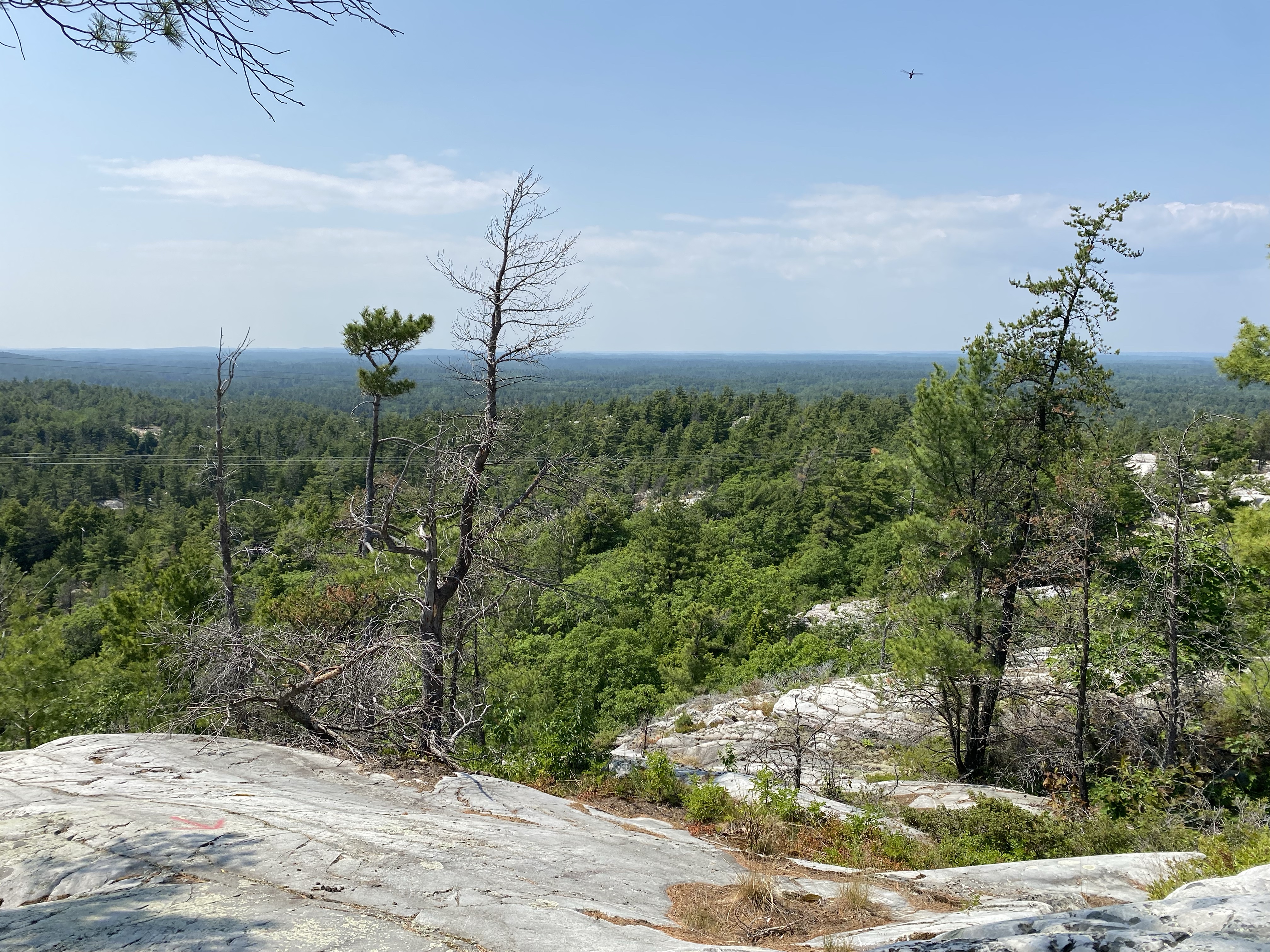 Part of the Escarpment Biosphere Conservancy (an Ontario-focused charitable land trust), Willisville Mountain Fire Tower Trail was first brought to our attention by Charlton Lake Camp owners, Dan and Lisa McGuire. They recommended it for its panoramic views of the La Cloche range and the surrounding area. According to Dan and Lisa, it was a hidden gem of trail. The trail, once you realize where it is, (They did say ‘hidden’ after all.) is marked with red dots and arrows that are repainted every year. Unlike many of the U.S. trails for which John and I are accustomed to hiking, this trail mostly consists of white quartzite, and it is steep–heading straight up the rock face of the mountain. We definitely recommend hiking shoes or boots for this route, but the views are nothing short of spectacular, momentarily allowing hikers to experience the soaring eye view of the local golden and bald eagles.