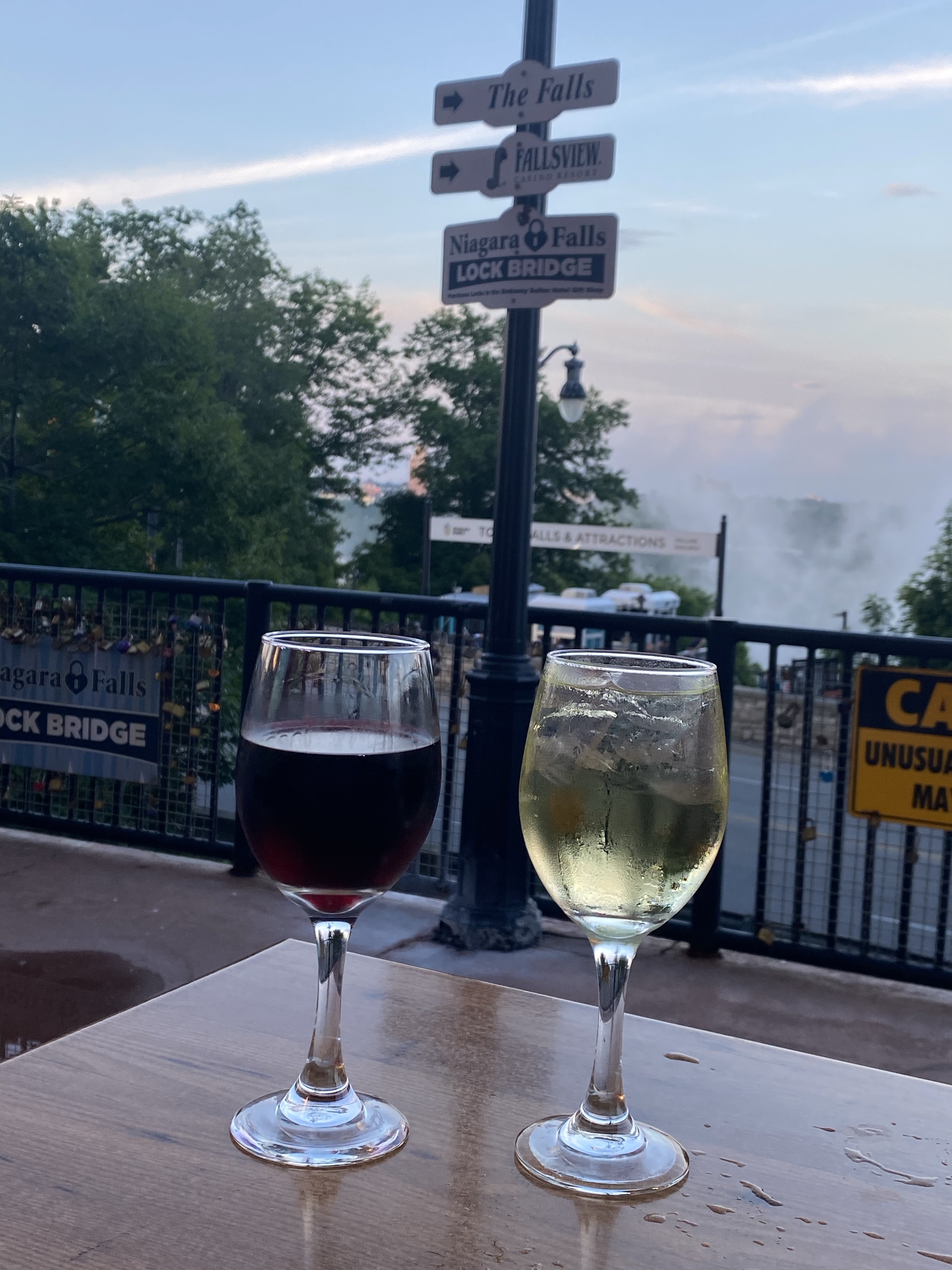 After dinner, we enjoyed a nightcap across from Bridal Veil Falls.