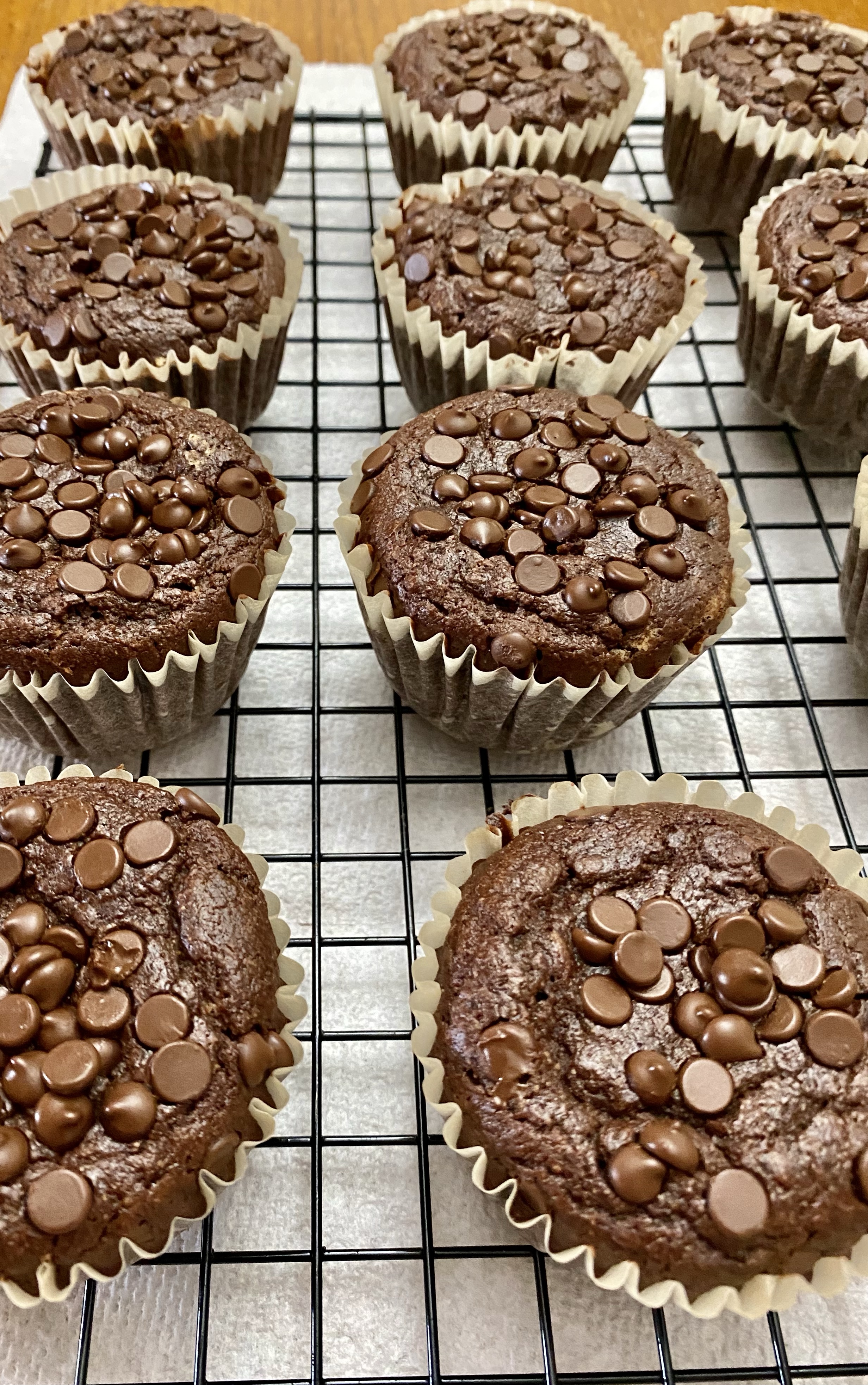 Even with all of these adaptations, please do not think I am saying this is an ultra-healthy breakfast recipe because oatmeal with fresh fruit, or avocado on whole grain toast, are probably healthier choices. However, for a special weekend or holiday treat, or even as a dessert, these muffins are full of a rich chocolatey flavor and texture that is oh-so-yummy! Serve them warm and drizzle your favorite topping over them or eat them plain. These muffins freeze well–for up to three months in an airtight container–for future weekend treats, so you can be sure none of your muffins go to waste.