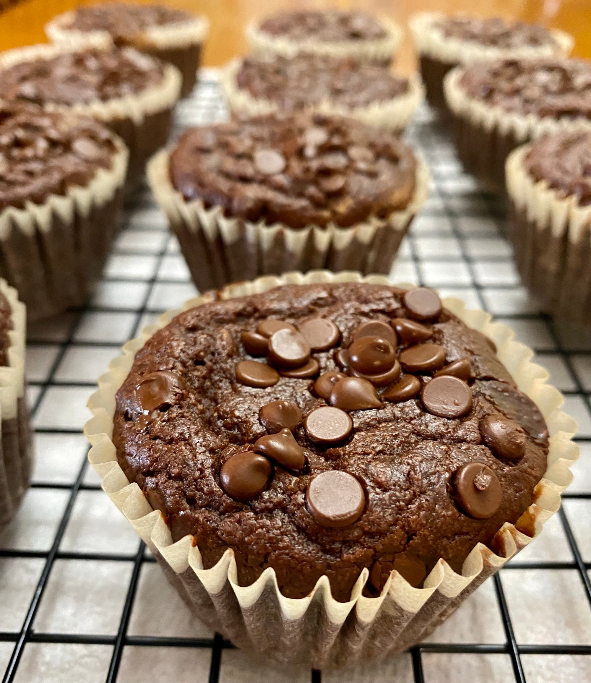 Even with all of these adaptations, please do not think I am saying this is an ultra-healthy breakfast recipe because oatmeal with fresh fruit, or avocado on whole grain toast, are probably healthier choices. However, for a special weekend or holiday treat, or even as a dessert, these muffins are full of a rich chocolatey flavor and texture that is oh-so-yummy! Serve them warm and drizzle your favorite topping over them or eat them plain. These muffins freeze well–for up to three months in an airtight container–for future weekend treats, so you can be sure none of your muffins go to waste.
