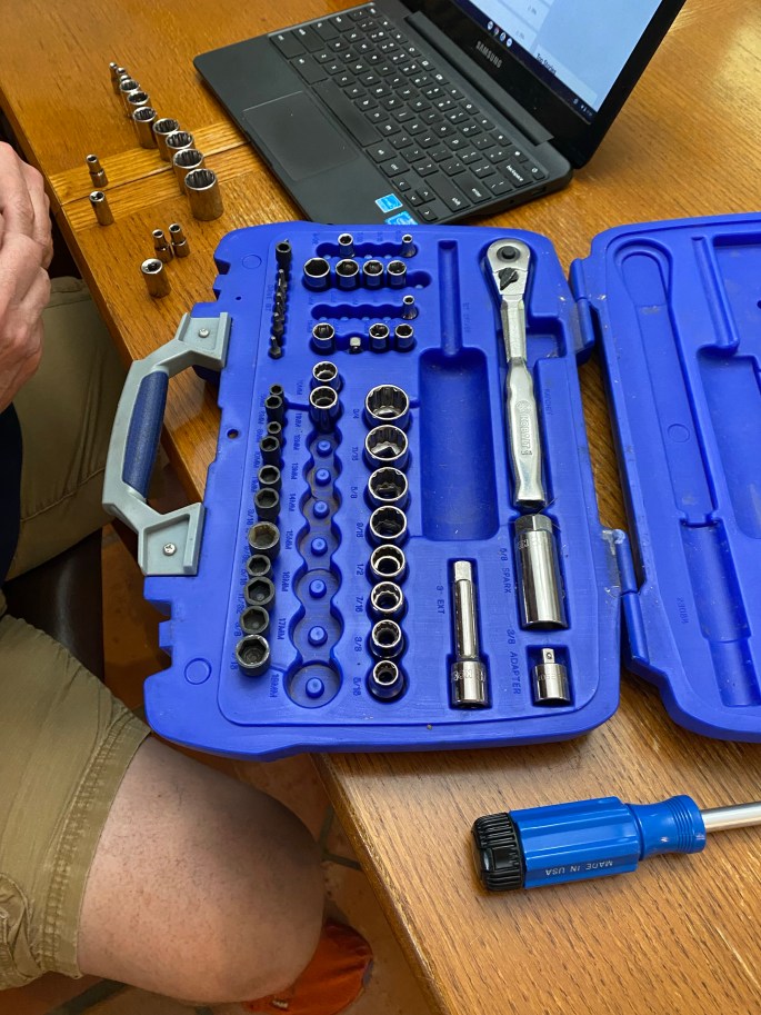 I heard the thud and subsequent scattering of parts.  Then, I heard John, my husband, enunciate a few choice words.  Since I wasn’t in the same room of the house, I wasn’t sure what had happened.  Soon enough, John walked into the kitchen-dining room area and set an open socket and driver kit on the table.  Pieces of varying sizes were scattered around the kit like a collage of autumn leaves covering a walkway.