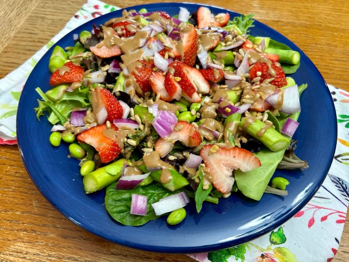 The salad recipe I am sharing with you is one delicious way to incorporate a variety of spring vegetables and at least one fruit into your day.  It is a bright and colorful salad, bursting with complimentary flavors and textures, and it can be made as a light main dish or a bright start to a meal.  Feel free to play with this recipe by using your favorite dressing, replacing the strawberries with another fruit, changing up the greens and vegetables, or by adding in a favorite protein, bean, or even a grain, such as quinoa.