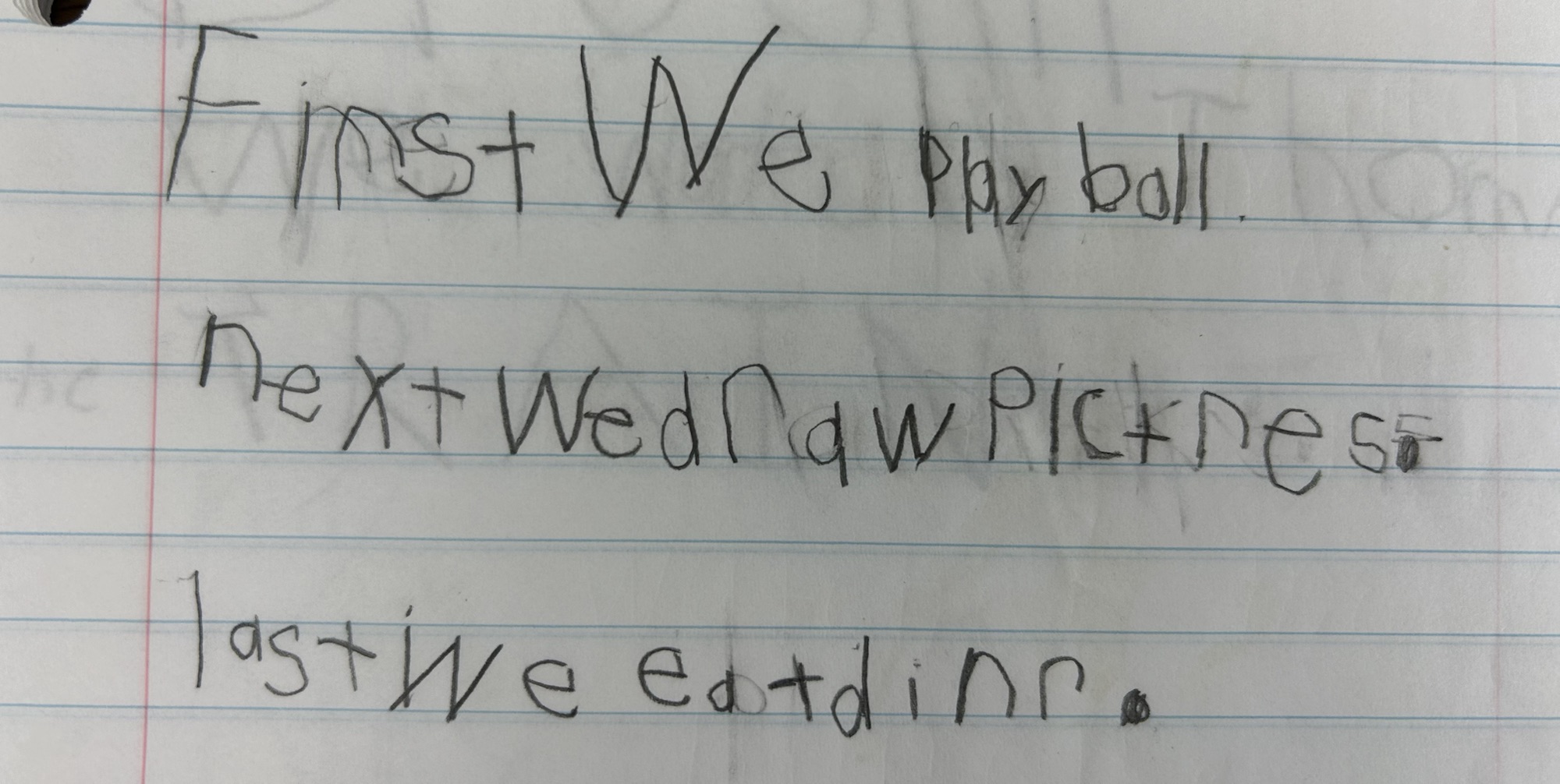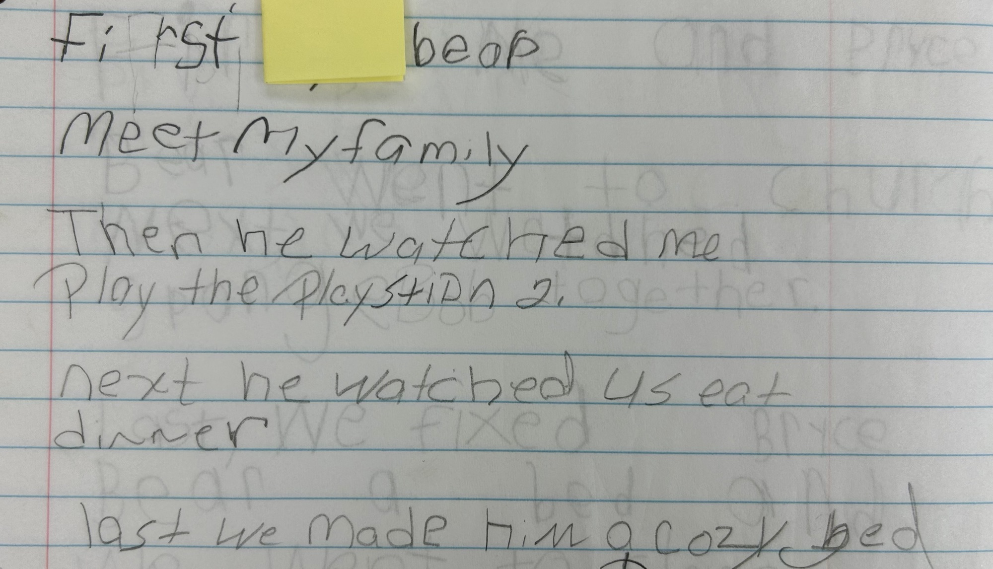 A “story” written by a student describing what happened when the student took home the grief therapy bear.