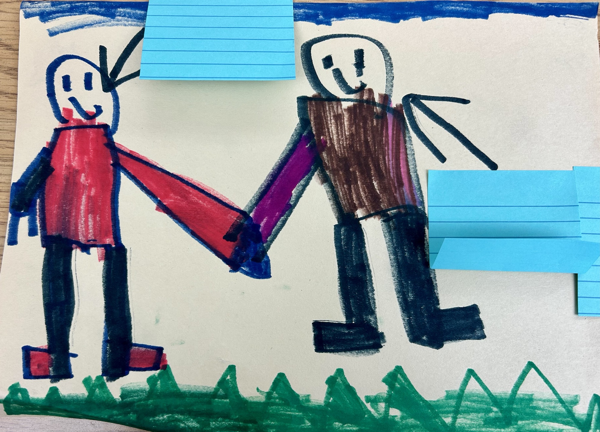 Another drawing depicting a student holding hands with the deceased classmate, adding that they missed their friend. (Names are covered with post-it notes.)