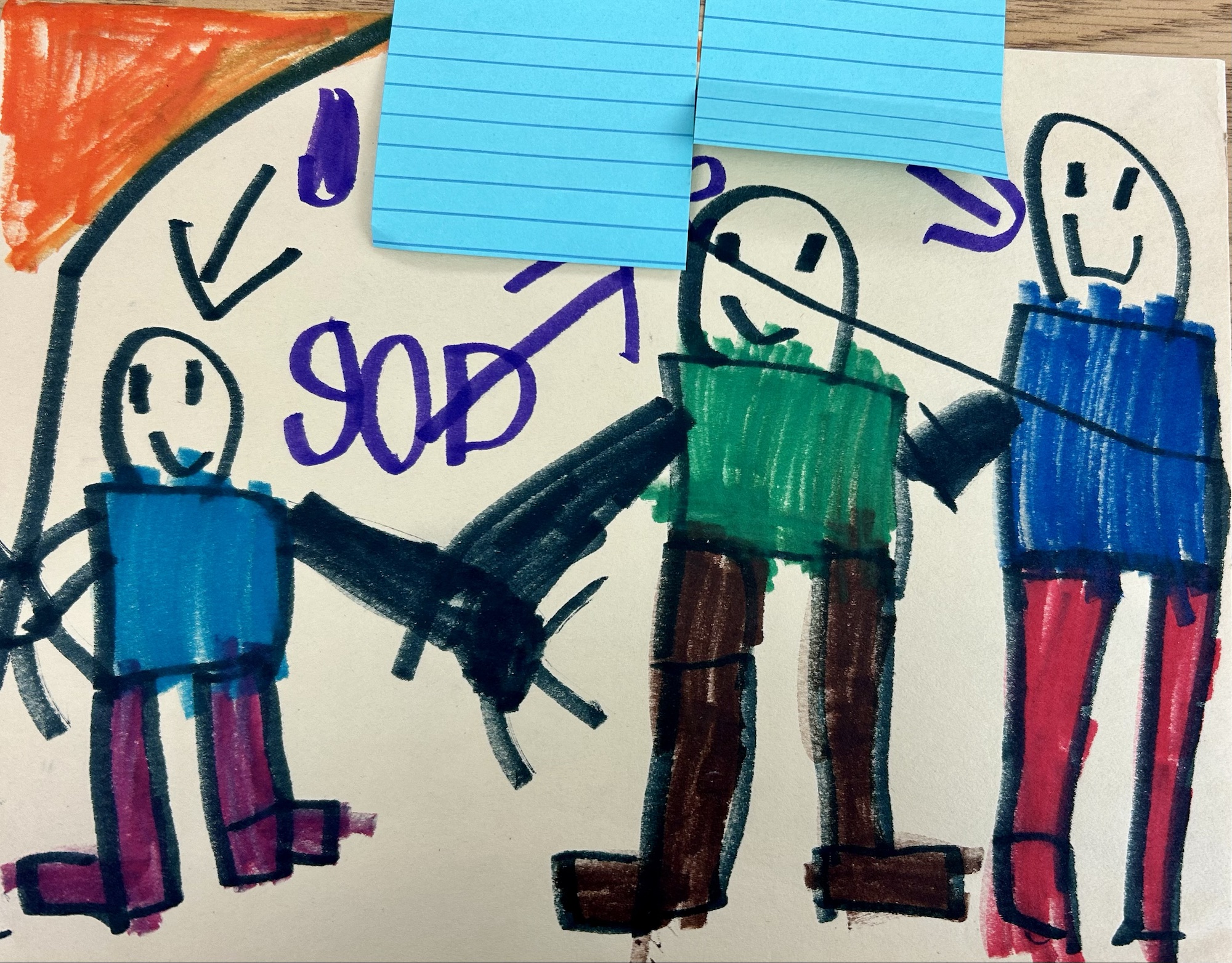 Another picture drawn by another student depicting their deceased friend, holding hands with God and Jesus.