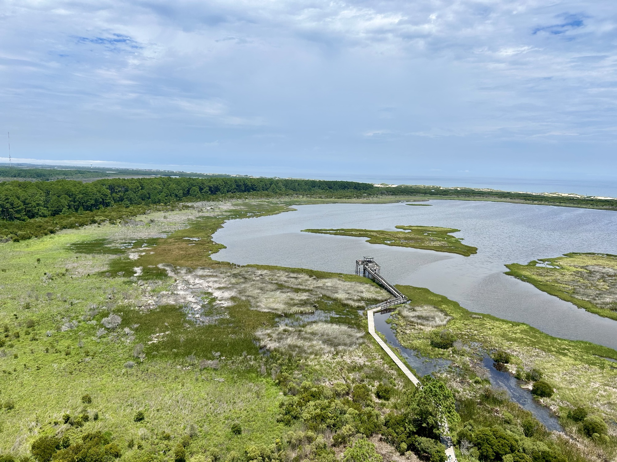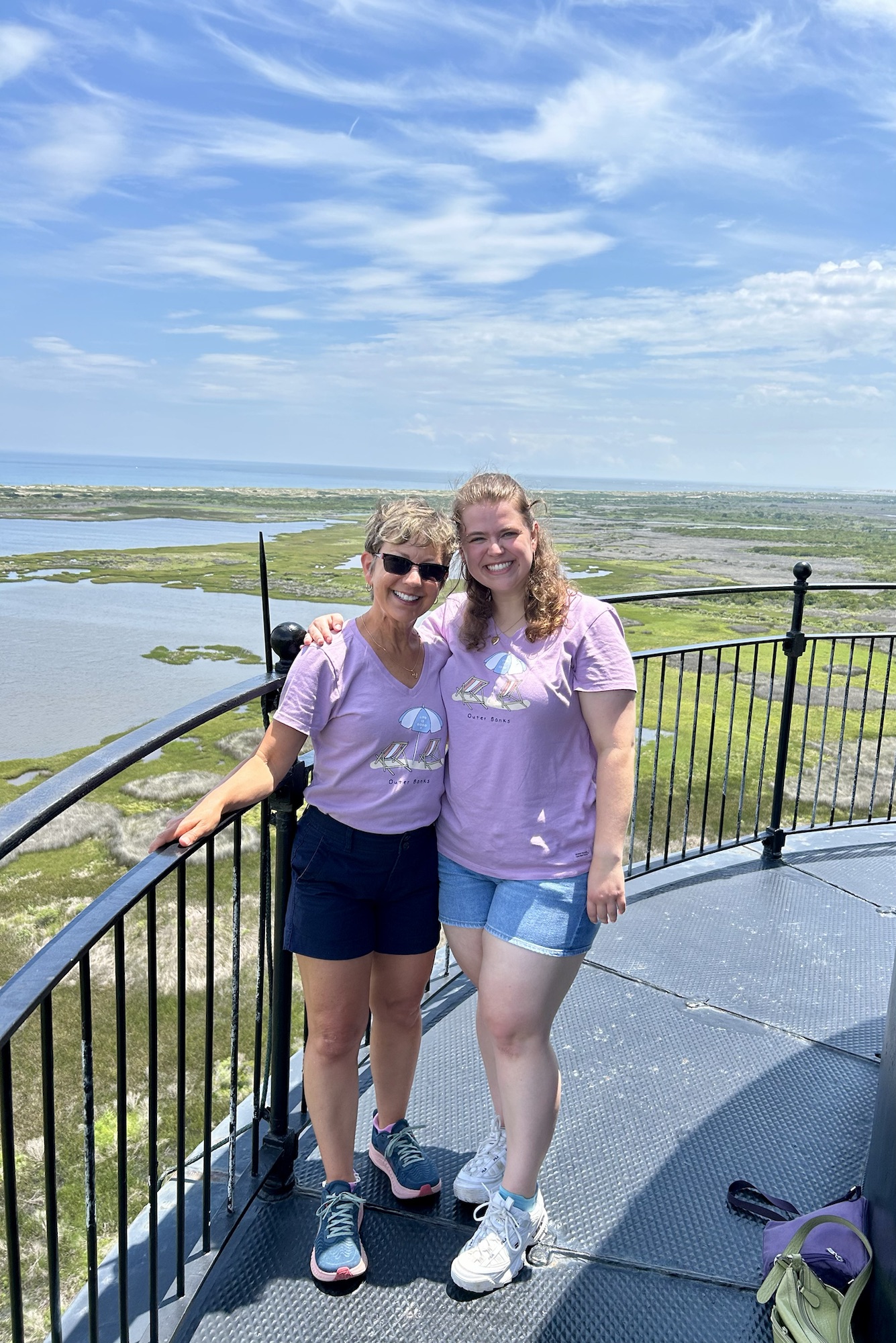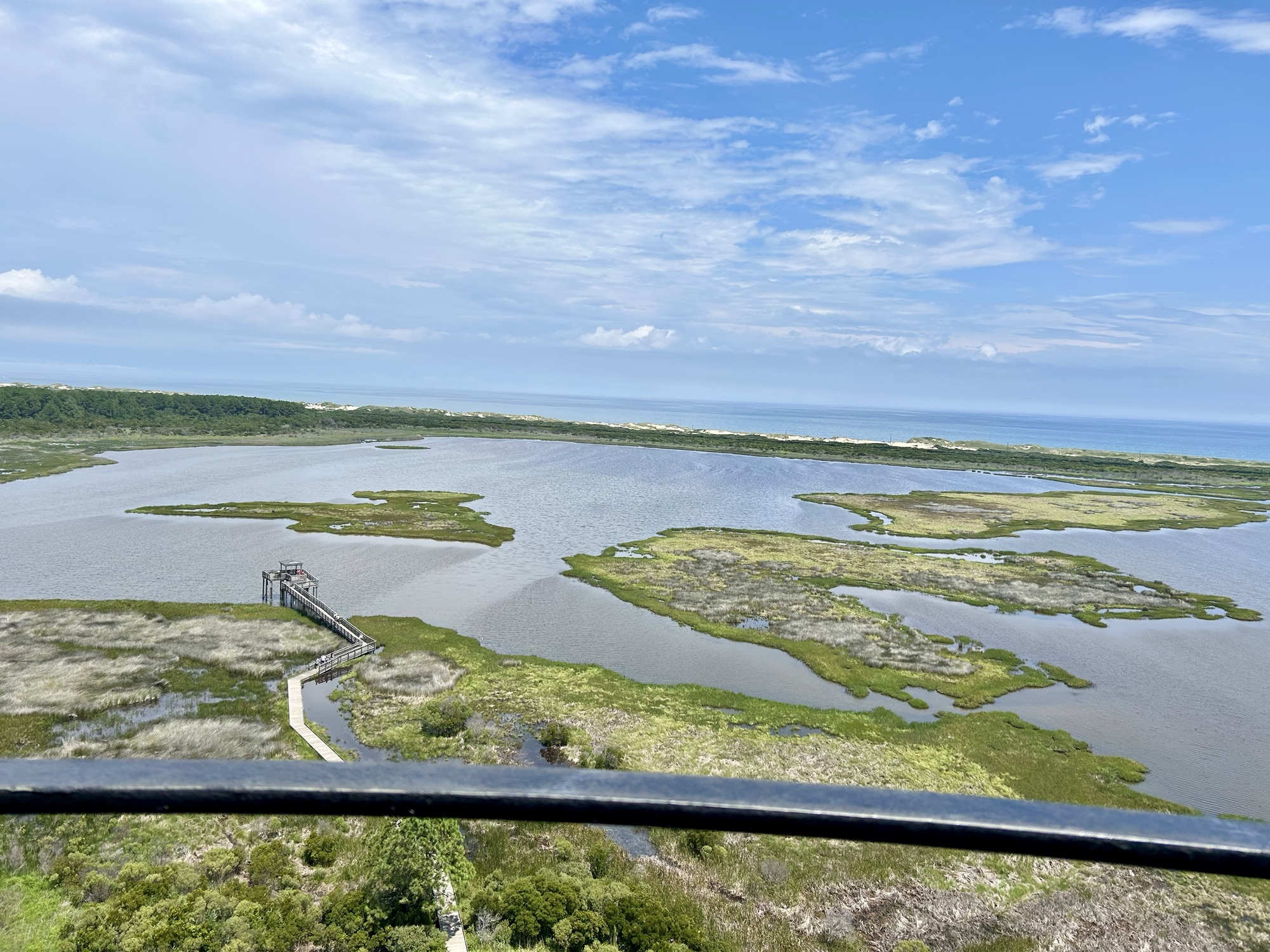Spread out before us was 360 degrees of the sweeping sights of Bodie Island, Pamlico Sound, and the Atlantic Ocean.  Astonished by the surrounding marshlands, pine trees, distant bridges, the various bodies of water, and a map-like view of the vicinity, we appraised how different the Hatteras Seashore looked from a bird’s eye view. In fact, we realized that we only saw a fragment of what was all around us whenever we drove along NC Route 12 to and from the lighthouse.