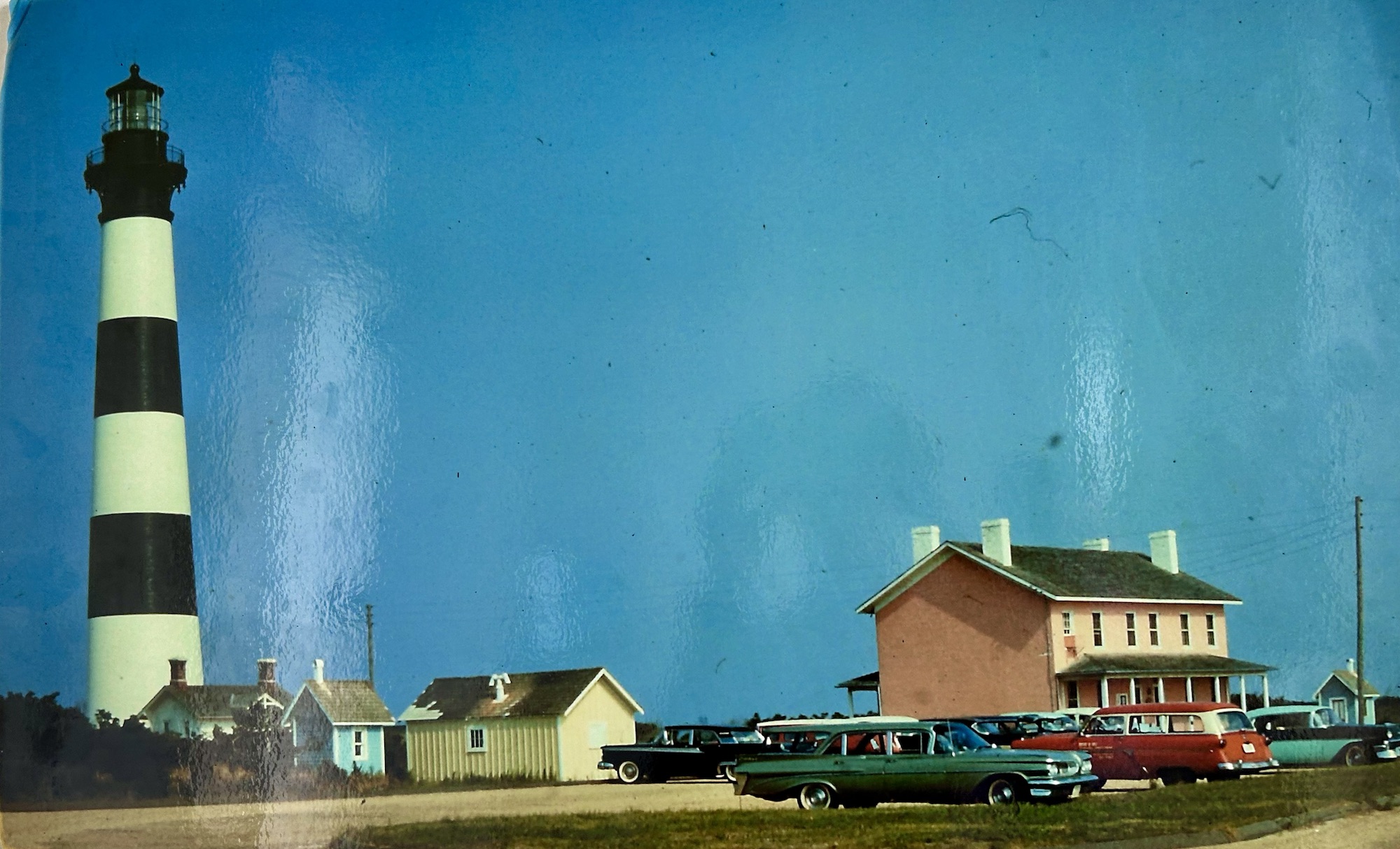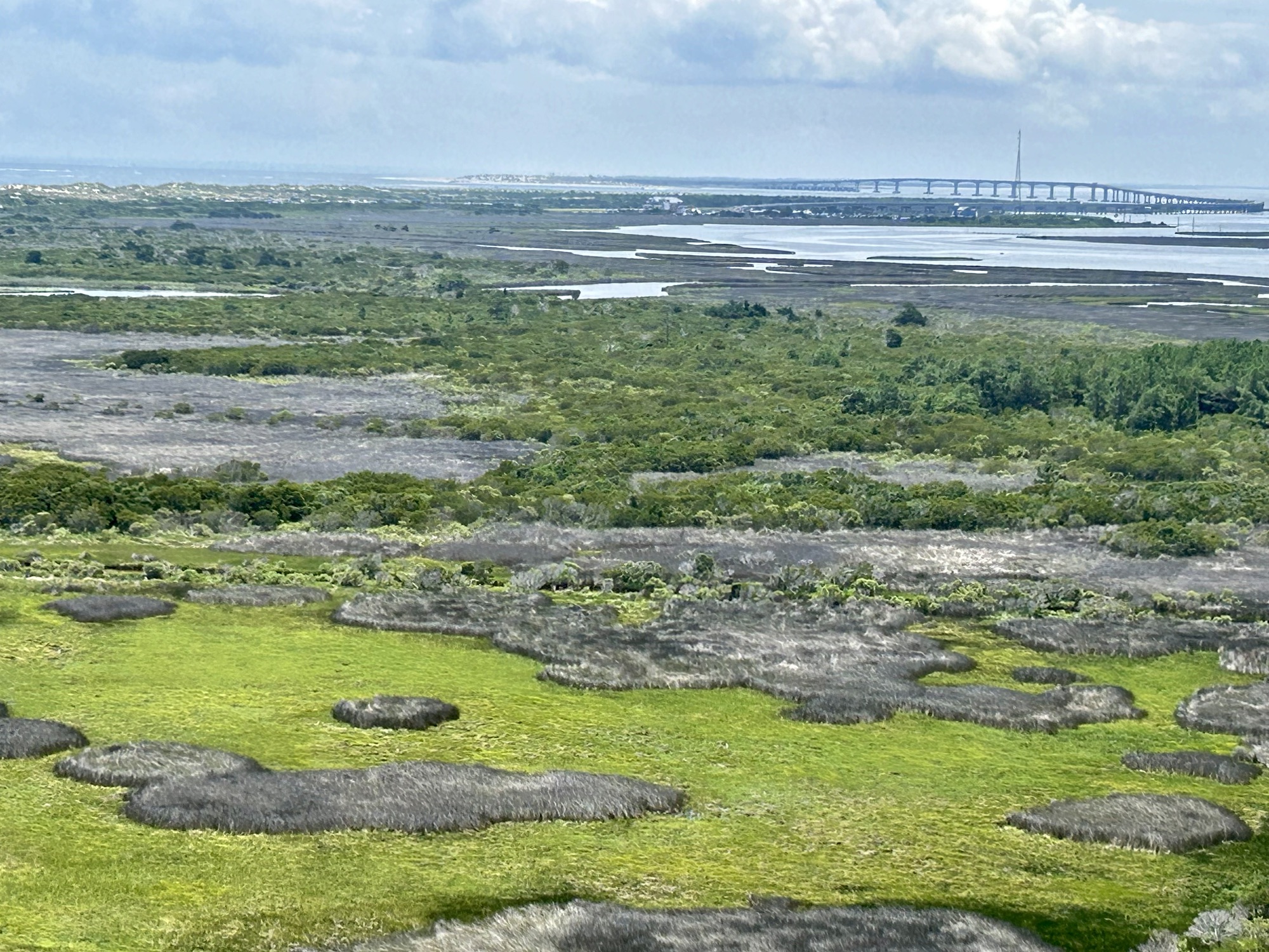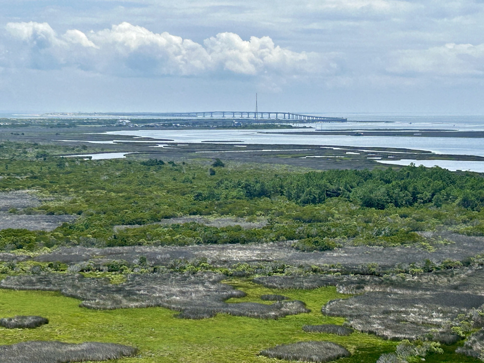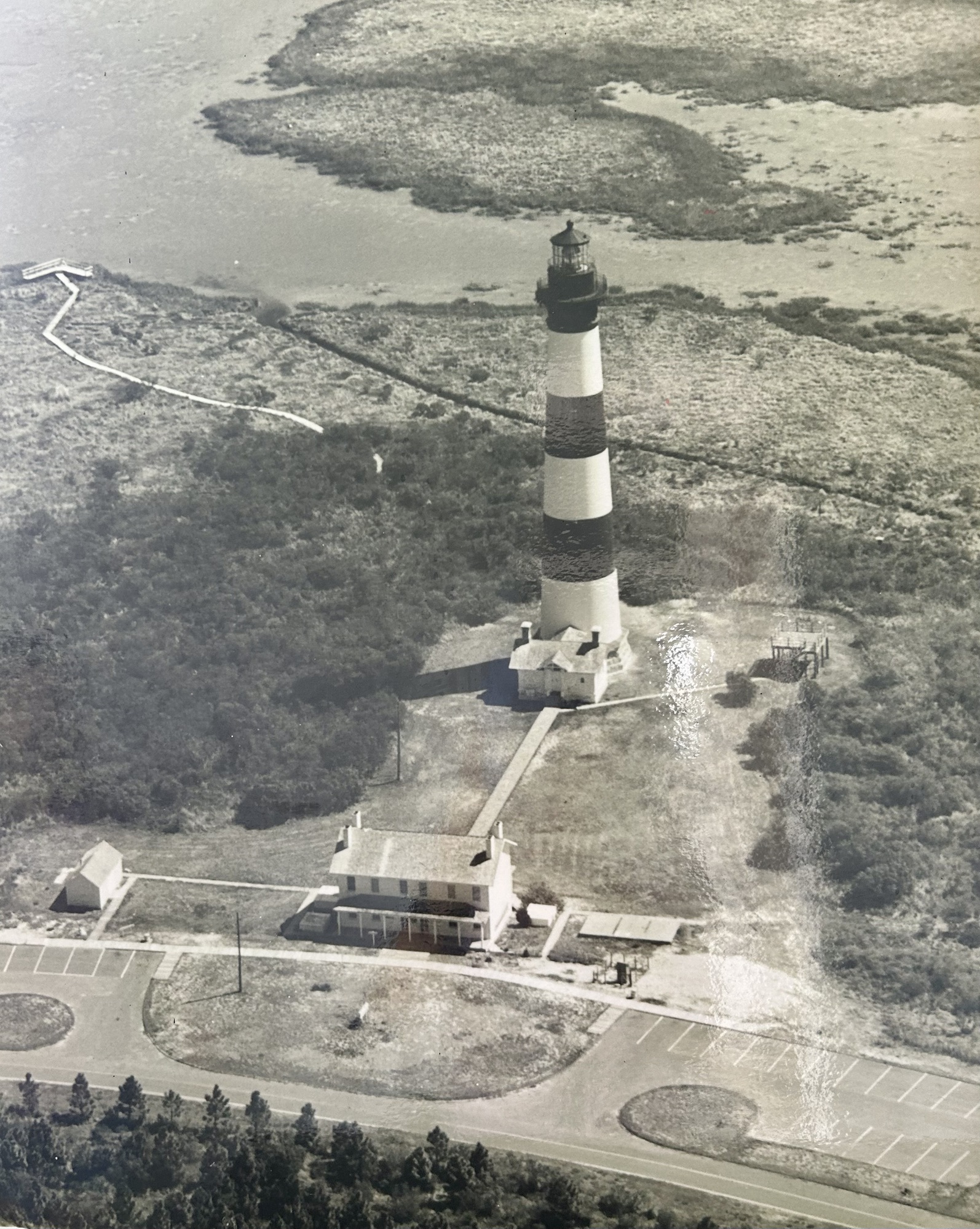 Spread out before us was 360 degrees of the sweeping sights of Bodie Island, Pamlico Sound, and the Atlantic Ocean.  Astonished by the surrounding marshlands, pine trees, distant bridges, the various bodies of water, and a map-like view of the vicinity, we appraised how different the Hatteras Seashore looked from a bird’s eye view. In fact, we realized that we only saw a fragment of what was all around us whenever we drove along NC Route 12 to and from the lighthouse.