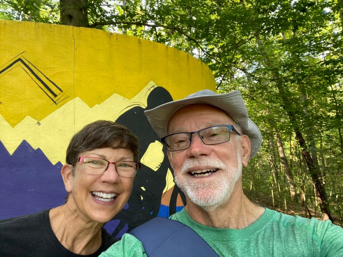 My dad and I followed the park worker’s advice and hiked the red and white trail–a gentle introduction to the Meeks Mountain Trails (MMT) system. This 3.2-mile trail offered us comfortable challenges, with exposed roots, rolling, rocky ascents and descents, a stream crossing, and switchbacks to keep things interesting. We thoroughly enjoyed the dappled morning sunlight as we made our way up, over, and around the trail. We marveled as a mountain biker powered up a sharp, twisting incline. A hesitant dog appeared to balk at the idea of crossing a stream while his running companion tried to coax the dog across, leaving us smiling.