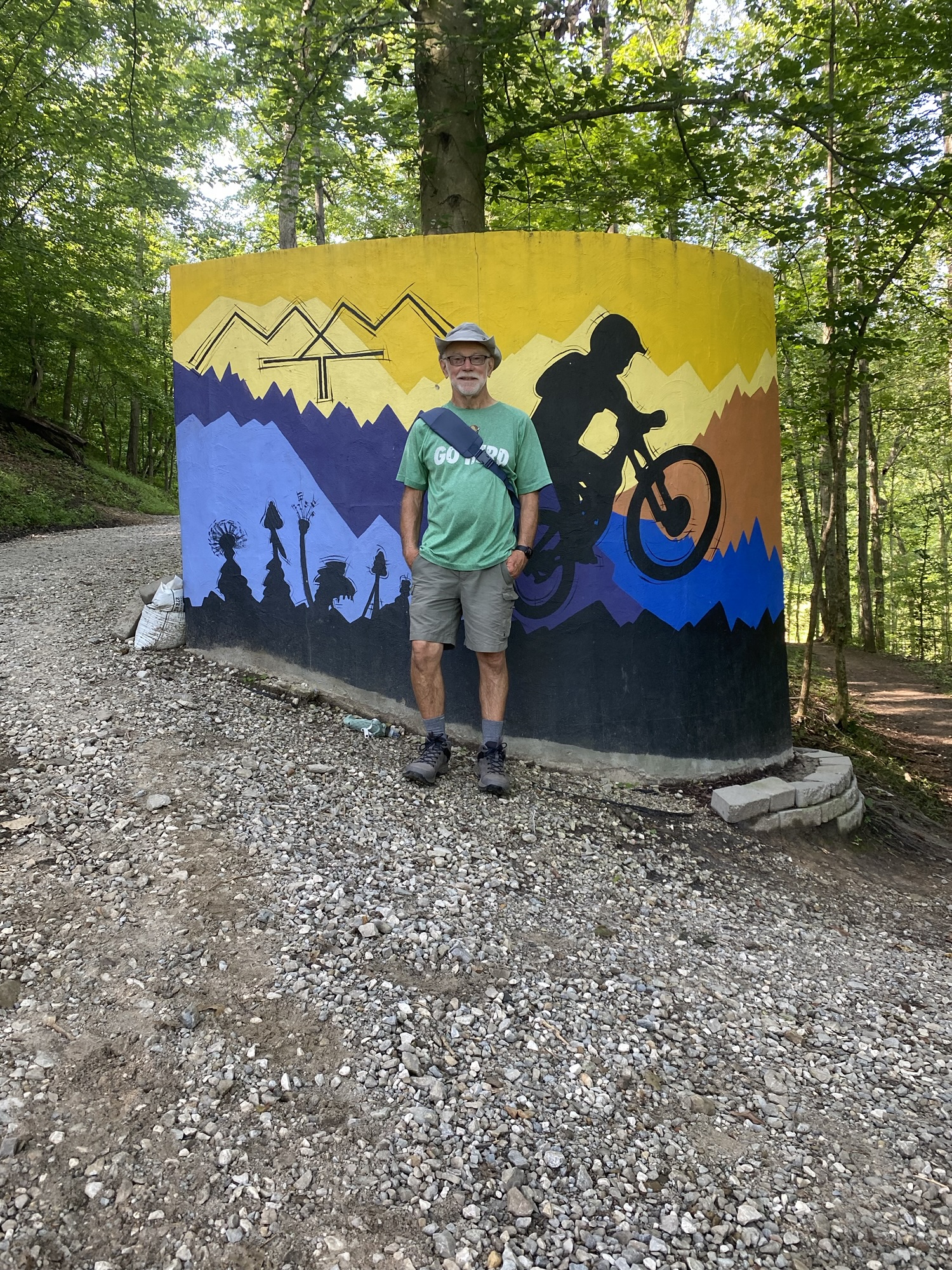 My dad and I followed the park worker’s advice and hiked the red and white trail–a gentle introduction to the Meeks Mountain Trails (MMT) system. This 3.2-mile trail offered us comfortable challenges, with exposed roots, rolling, rocky ascents and descents, a stream crossing, and switchbacks to keep things interesting. We thoroughly enjoyed the dappled morning sunlight as we made our way up, over, and around the trail. We marveled as a mountain biker powered up a sharp, twisting incline. A hesitant dog appeared to balk at the idea of crossing a stream while his running companion tried to coax the dog across, leaving us smiling.