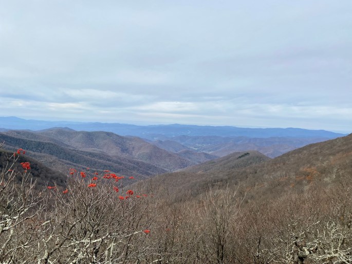 There were two trails at the top of our list of preferred hiking experiences–one that led to Rattlesnake Lodge and another to the top of Craggy Pinnacle. Unfortunately, we were not able to hike either one. Instead, on one of the afternoons during our trip, we found ourselves at the closed-for-the-season Craggy Garden Visitor Center, with its ample parking area and scenic views, staring at a map of hiking trails that could all be accessed from the parking lot. We picked one that wasn’t part of our so-called list-for-the-day and headed off down the trail without conducting any research. Why not, right? After all, we had already successfully hiked one of the trails shown on the map on a previous trip; therefore, how much more difficult could another trail in the same area be?
